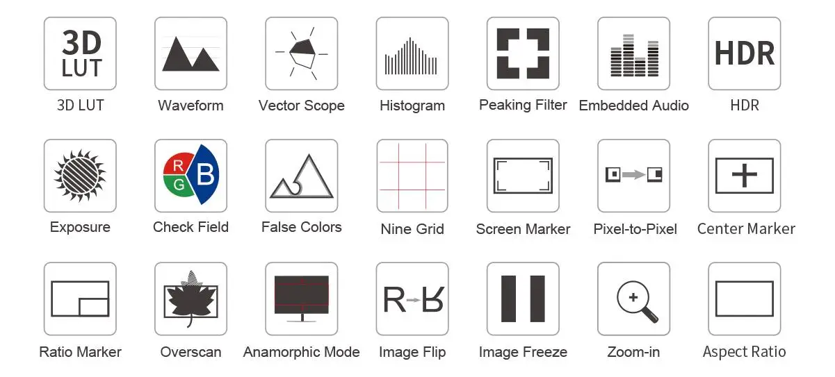 Built-in waveform monitoring, you can choose from waveform (RGB Parade, YUV Parade, Y Parade), vector scope, histogram, audio phase and level displays, and get broadcast accurate waveform monitoring that shows everything you need to know technically about your video and audio signals. The functions can be opened separately, and also support one key to open all scope mode. When the function is turned on separately, you can also move its the horizontal or vertical position in Menu. T10 becomes the ideal choice for live production monitoring, so you no longer need to use a separate expensive scopes!