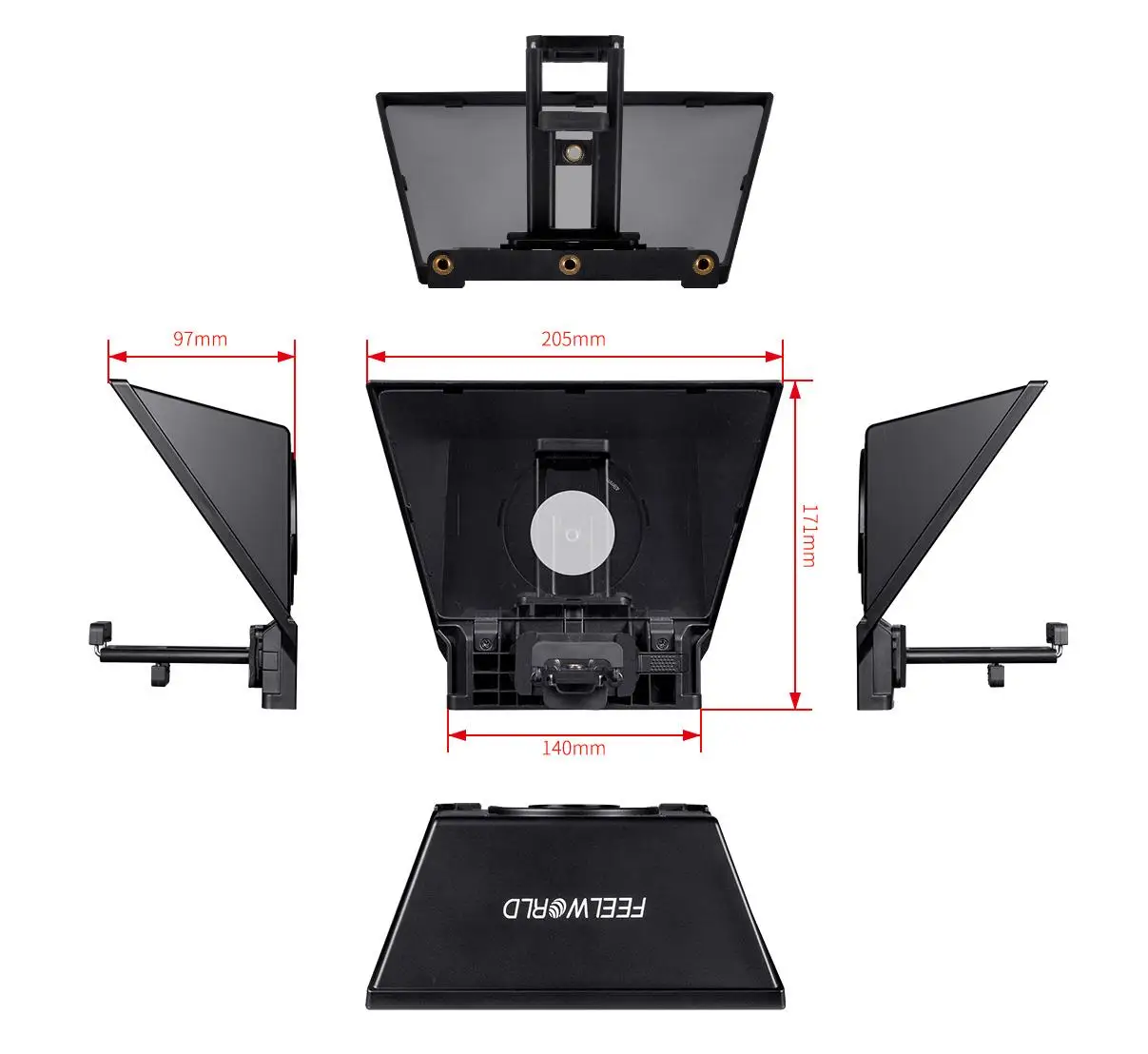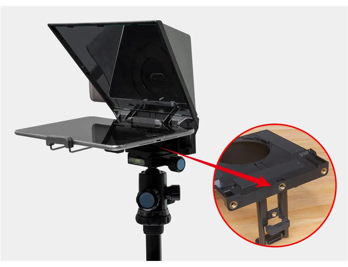 En la parte inferior del teleprompter hay tres orificios de montaje de tamaño estándar de 1/4, que se pueden conectar a un trípode, un soporte de luz, etc.