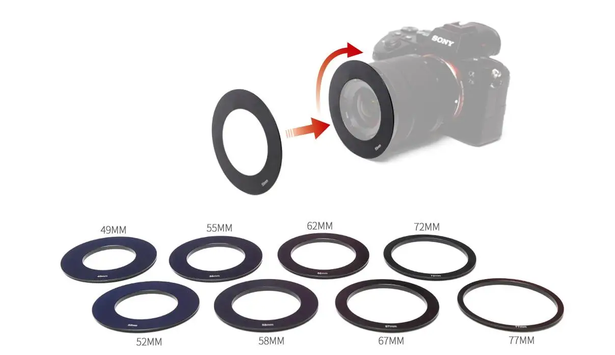 TP2 con ocho anillos adaptadores de lentes estándar de 49/52/55/58/62/67/72/77 mm.Puede elegir uno que se adapte a la lente de su cámara.