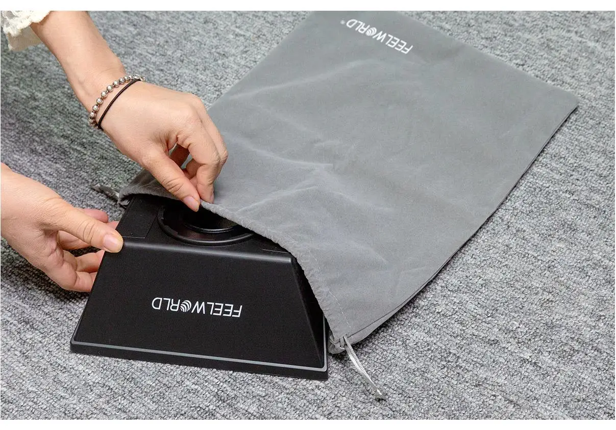 El TP2 es de tamaño compacto y pesa solo 300 gramos, lo que es fácil de guardar en una bolsa con cordón adjunta para proteger el teleprompter y al mismo tiempo permitir una transición rápida.Además, el paño de microfibra adjunto puede mantener limpio el teleprompter en todo momento.