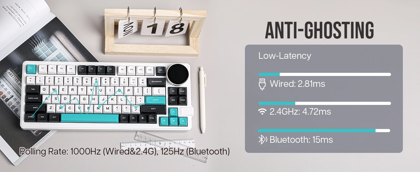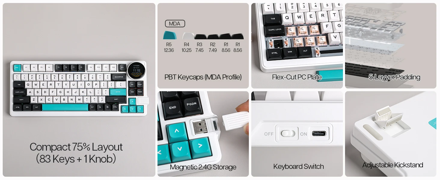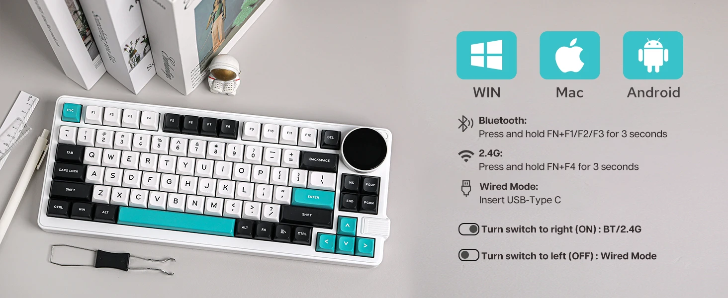 El Feker K75 Lite admite tres modos de conectividad: USB-C con cable, Bluetooth y inalámbrico 2.4G, lo que le permite cambiar sin esfuerzo para un rendimiento óptimo.La batería incorporada de gran capacidad de 5000 mAh garantiza una energía duradera, eliminando la necesidad de cargas frecuentes y lo que la hace ideal para un uso prolongado durante el trabajo o el ocio.