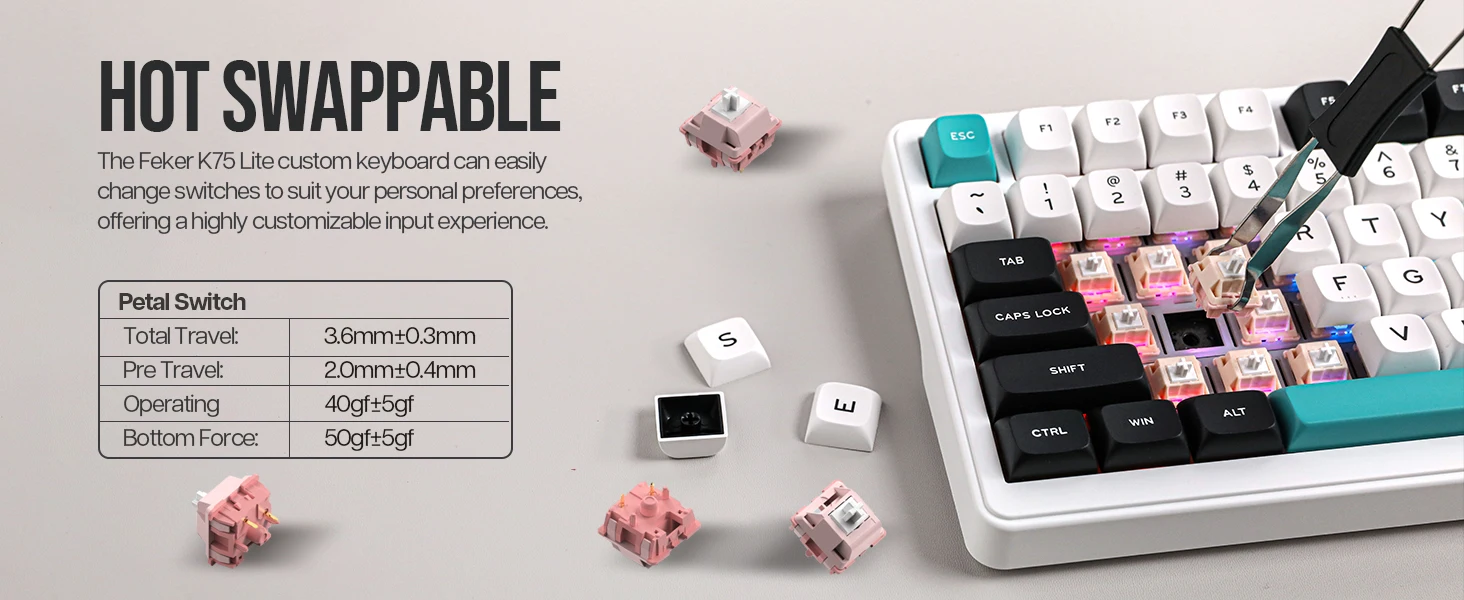 Nota: La compra de un Feker K75 Lite viene con un reposamuñecas gratuito, un reposamuñecas negro para teclados negros y un reposamuñecas blanco para teclados blancos y rosas.