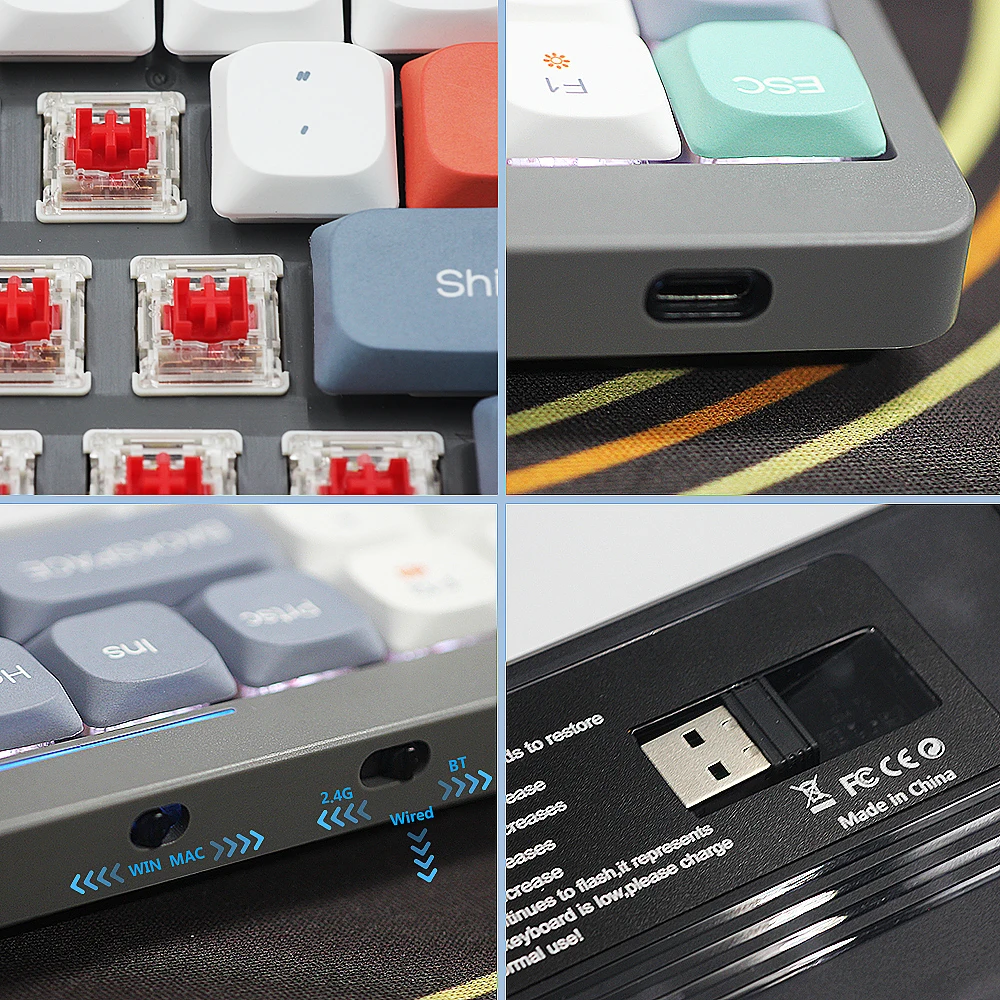 PS: If you have already matched Bluetooth or 2.4G, switch to the corresponding mode and it will automatically reconnect. You do not need to enter the pairing mode again. If there is no operation within three minutes in the wireless mode, the backlight of the keyboard will be automatically turned off to save power. Pressing any key can directly wake up.