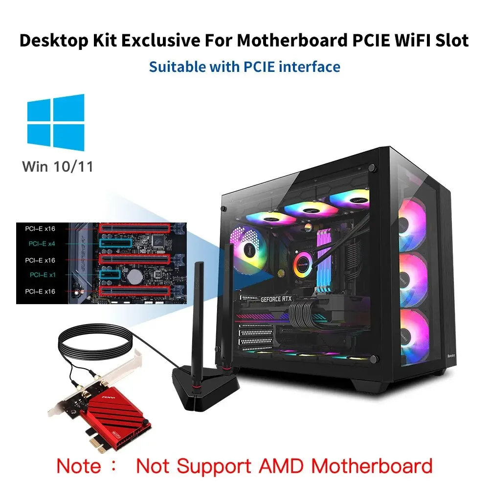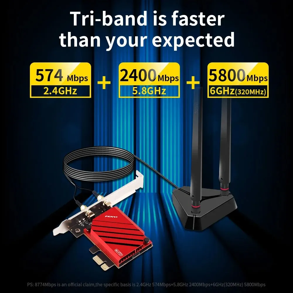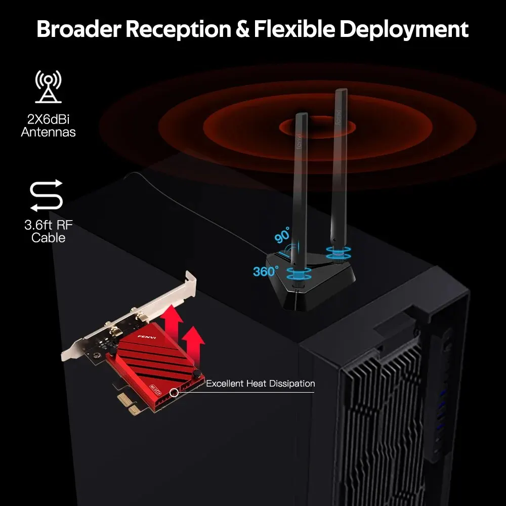 • Conectividad inalámbrica de alta velocidad:Experimente juegos en línea sin problemas con el adaptador Fenvi Wifi7 PCIe, que ofrece una velocidad de transmisión de 1200 Mbps y una frecuencia compatible con Wi-Fi de 2,4G y 5G.