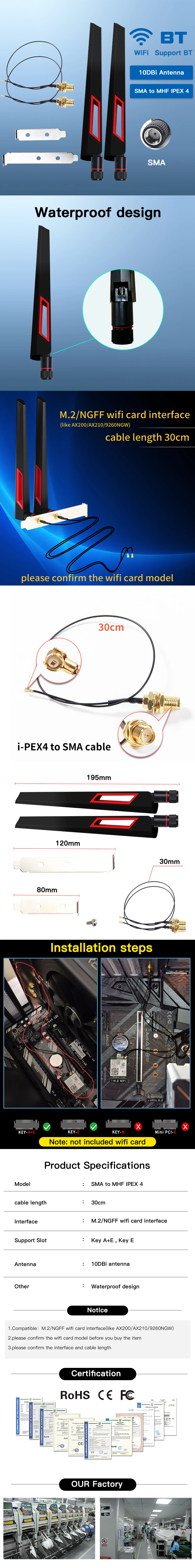 Fenvi 2pcsx10dbi antena conjunto AX210 séptima tarjeta WiFi 2,4/5GHz Dual Band M.2 mhf4 cable de extensión a WiFi RP-SMA para AX210/ax200ngw