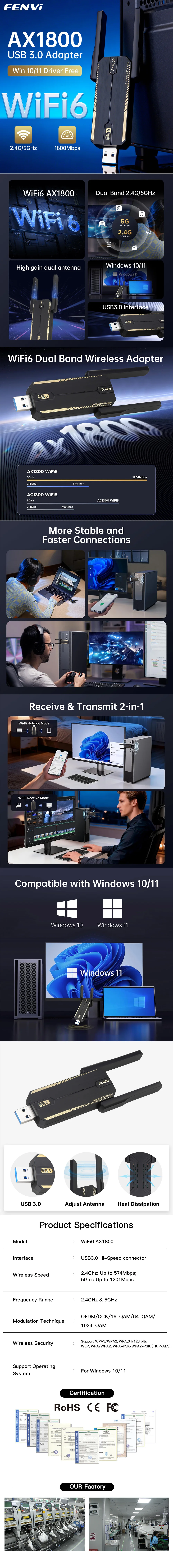 Adaptador USB FENVI WiFi 6 AX1800, receptor USB de doble banda de 2,4G/5Ghz, tarjeta de red Dongle, tarjeta Wi-Fi inalámbrica para ordenador portátil, PC Win10/11