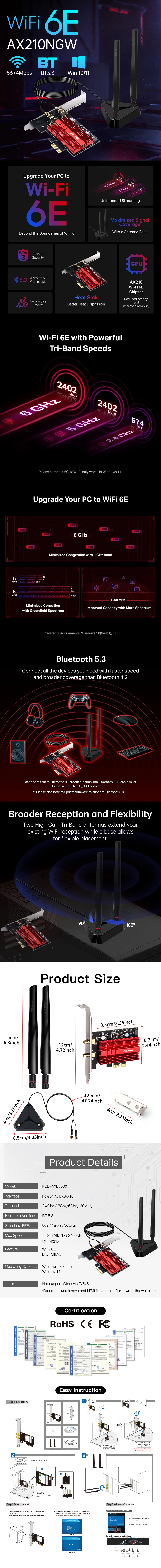 Tarjeta de red inalámbrica FENVI FV-AXE3000Pro WiFi 6E AX210
