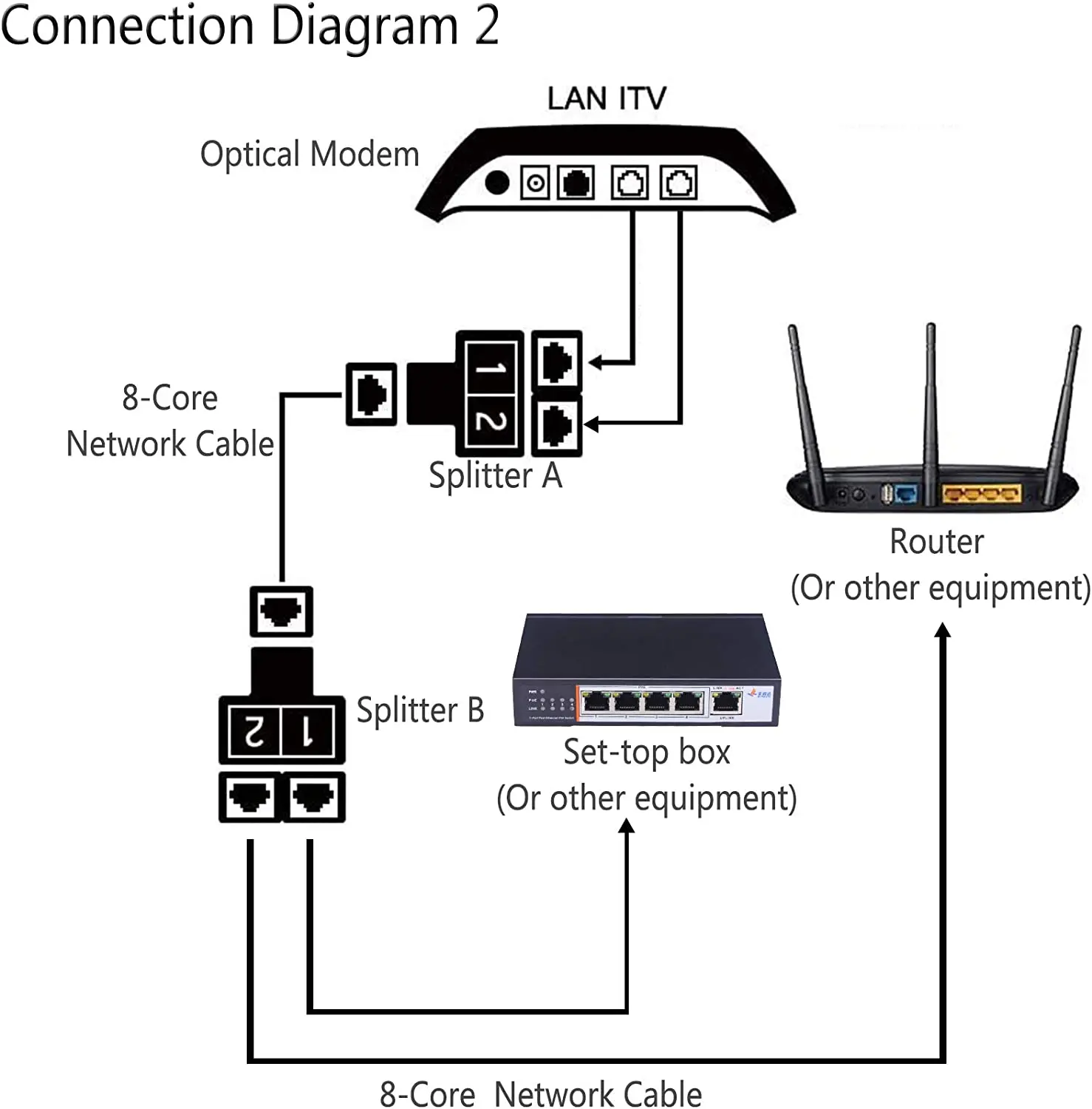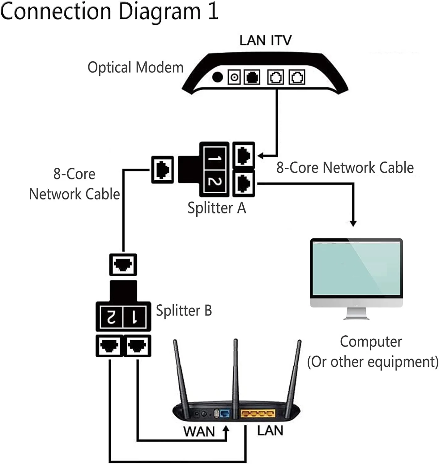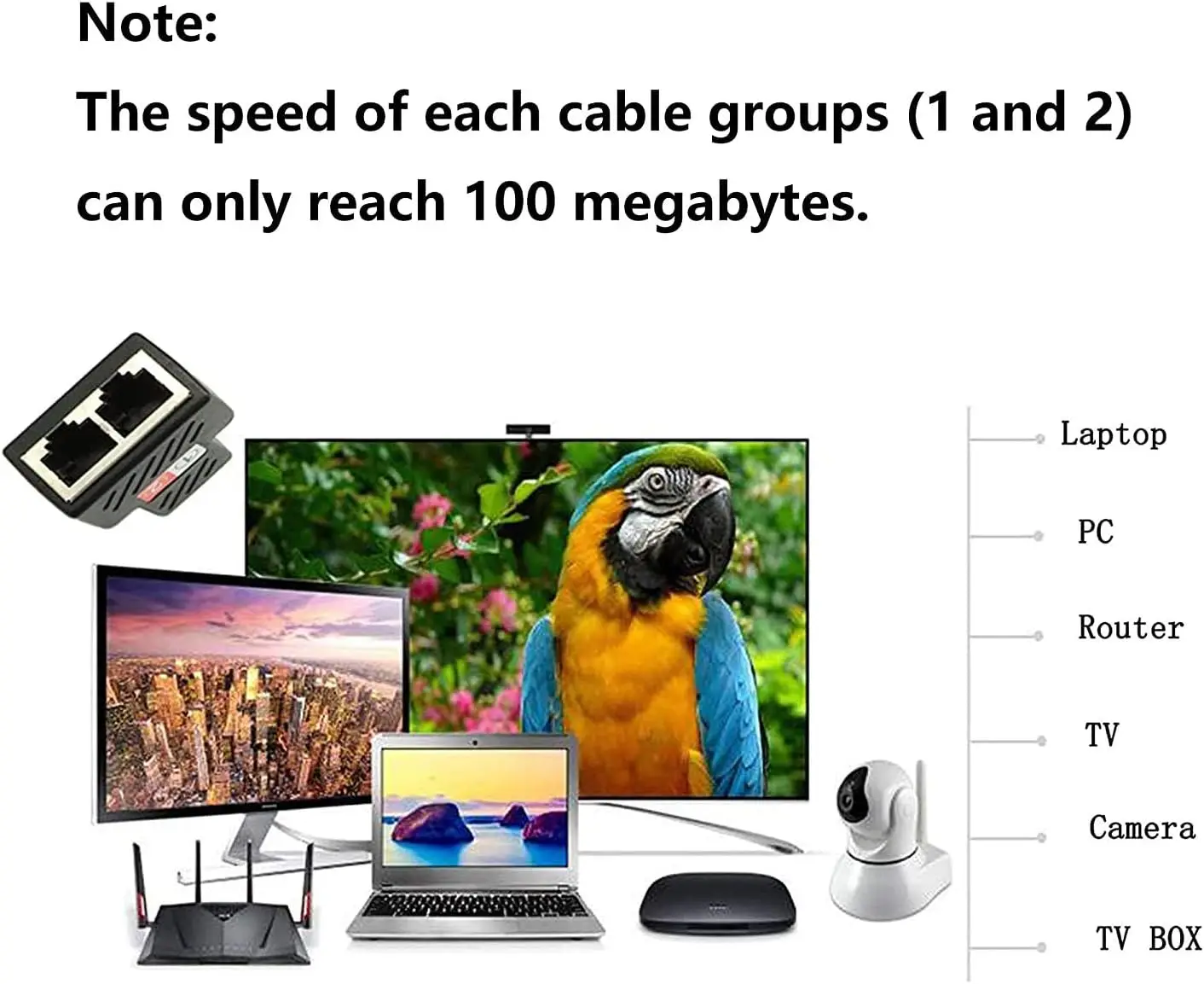 【Velocidad de transmisión】 El divisor Ethernet RJ45 puede dividir un cable de red en dos salidas, y la velocidad de cada grupo de cables de red (1 y 2) solo puede alcanzar 100 Mbps. Y la transmisión de señal de los dos juegos de cables no interferirá entre sí.