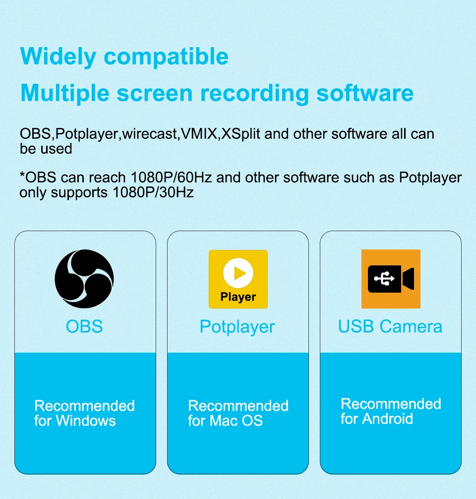 * Admite la mayoría del software de adquisición, como VLC OBS.Amcap, etc; * Compatible con Windows y MacOS;