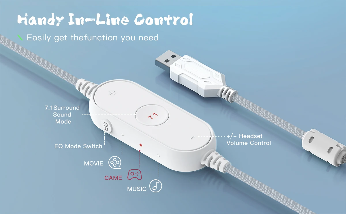 Take full control of your audio with the built-in control panel on the headset, allowing you to adjust headphone and microphone volume, toggle surround sound, and mute the microphone with ease, all within your fingertips.What's more, you can customizable sound modes for every occasion. Switch between game, music, and movie EQ modes to optimize your audio experience for different scenarios, ensuring optimal sound quality and enhancing your enjoyment.
