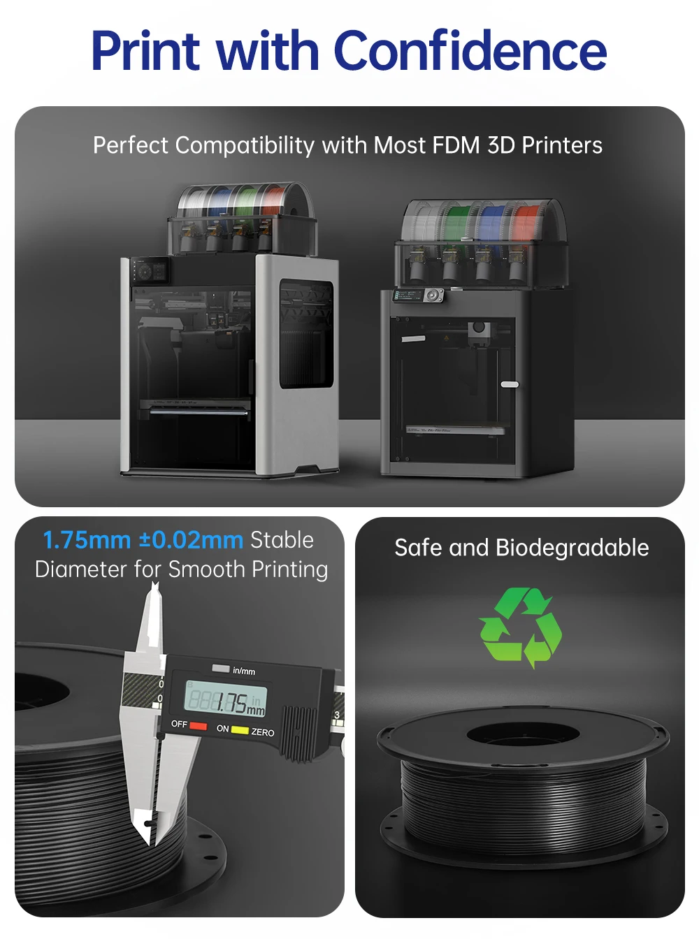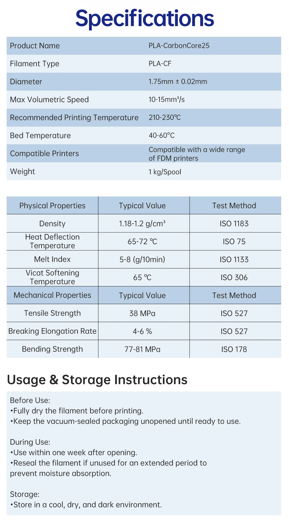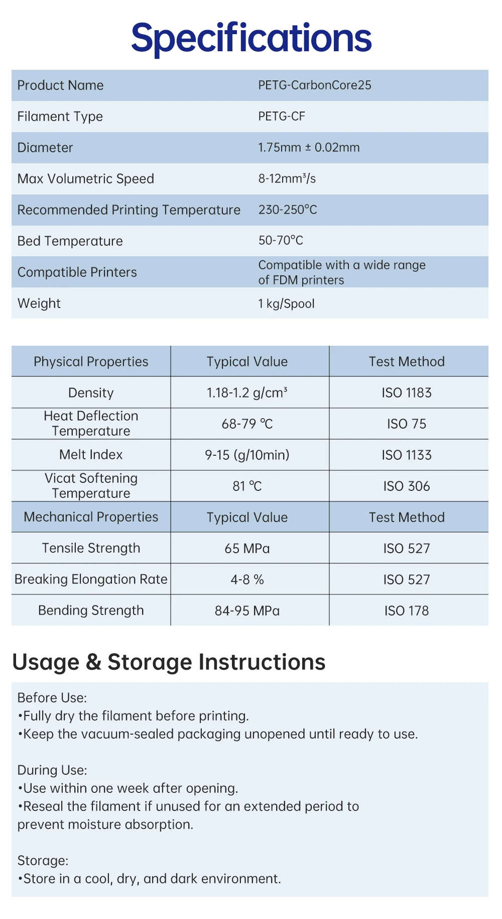 Temperatura de la cama90-100°CImpresoras compatiblesCompatible con una amplia gama de impresoras FDMPeso1 kg/CarreteInstrucciones de uso y almacenamientoAntes de usar:*Seque completamente el filamento antes de imprimir.*Mantenga el embalaje sellado al vacío sin abrir hasta que esté listo para usar.Durante el uso:*Usar dentro de una semana después de abrir.*Quitar el filamento si no se usa durante un período prolongado para evitar la absorción de humedad.Almacenamiento: · Almacenar en un ambiente fresco, seco y oscuro.