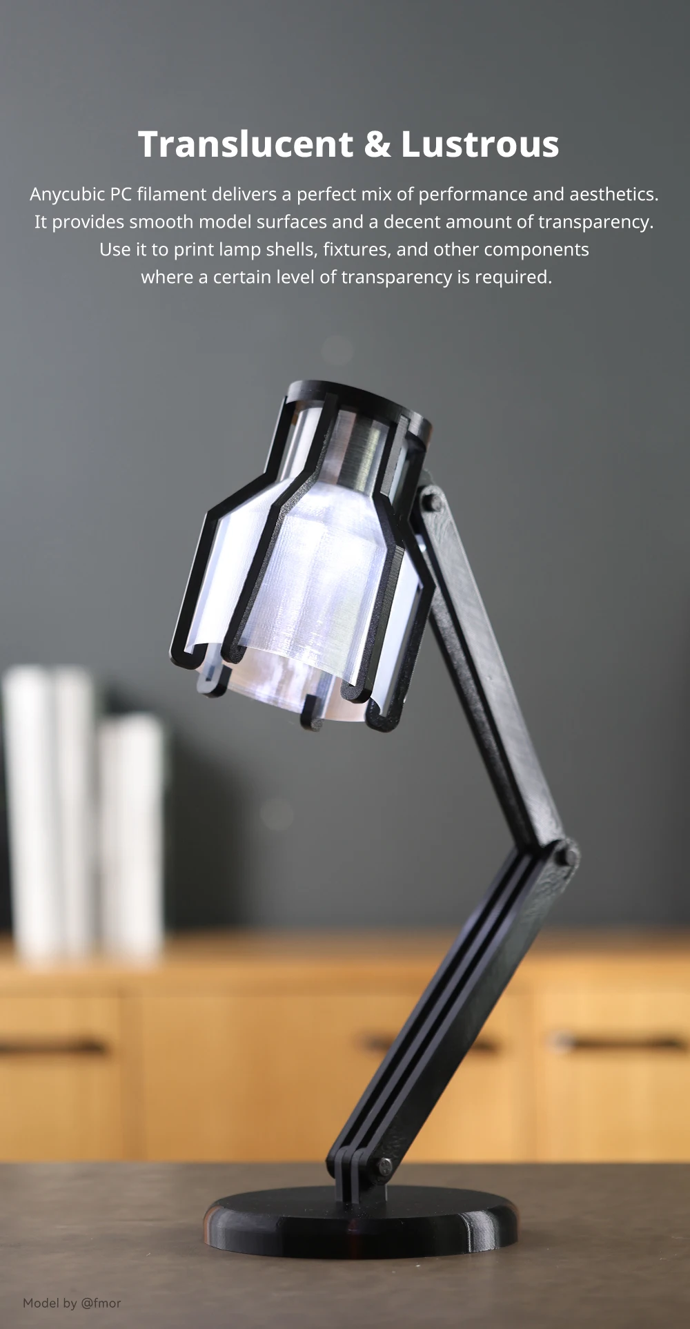 El filamento de PC Anycubic ofrece una combinación perfecta de rendimiento y estética.Proporciona superficies de modelo lisas y una decente cantidad de transparencia.Úselo para imprimir carcasas de lámparas, accesorios y otros componentes donde se requiere un cierto nivel de transparencia.