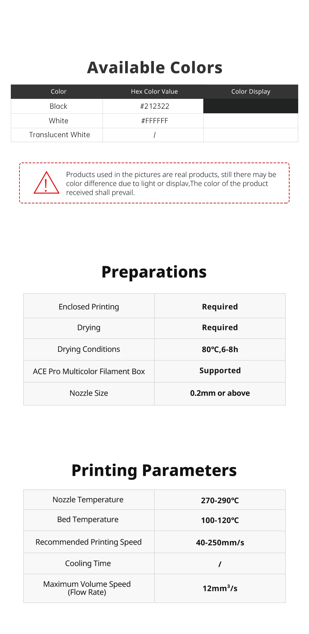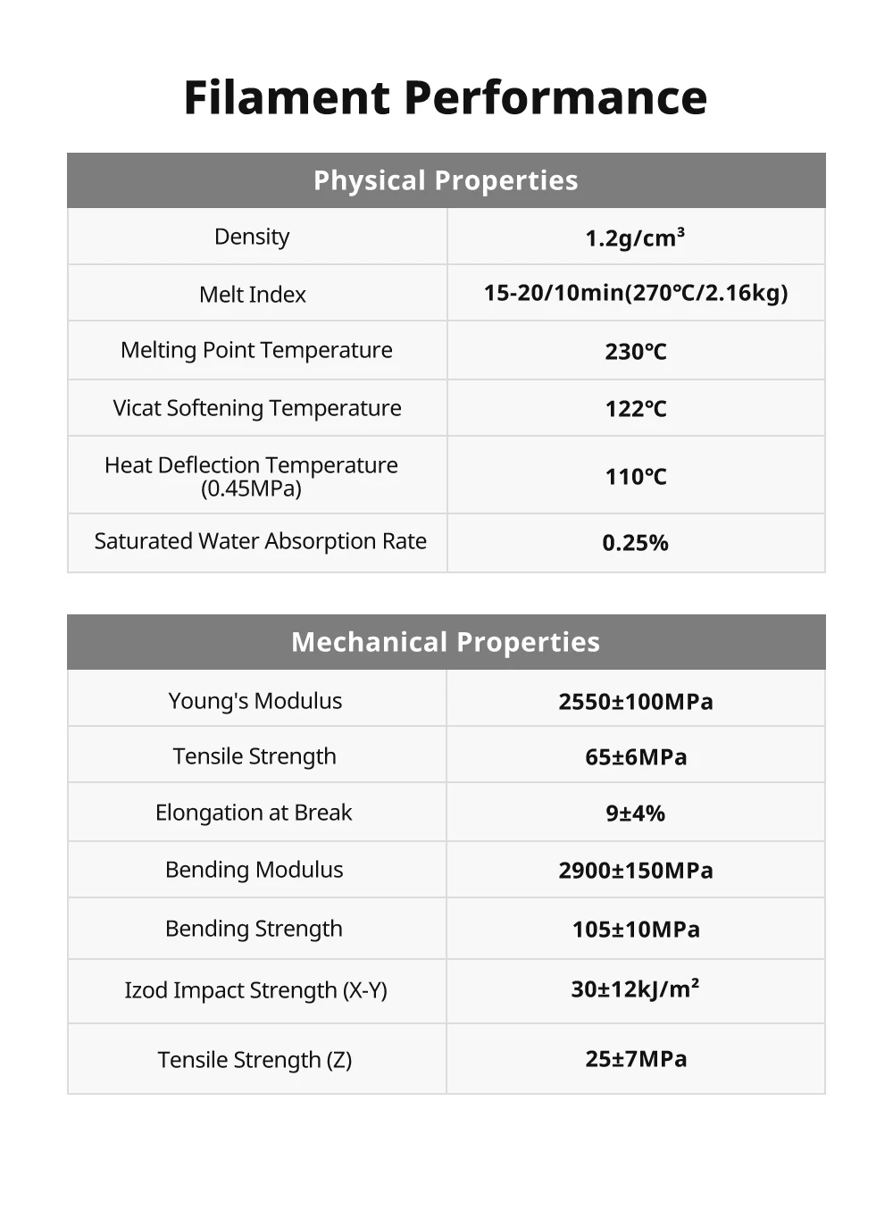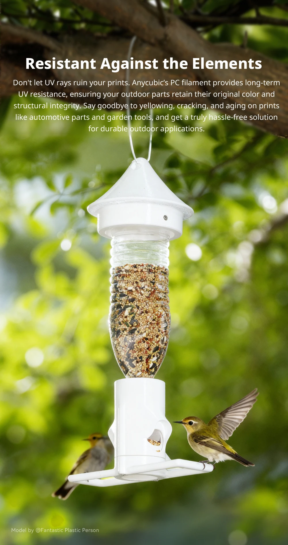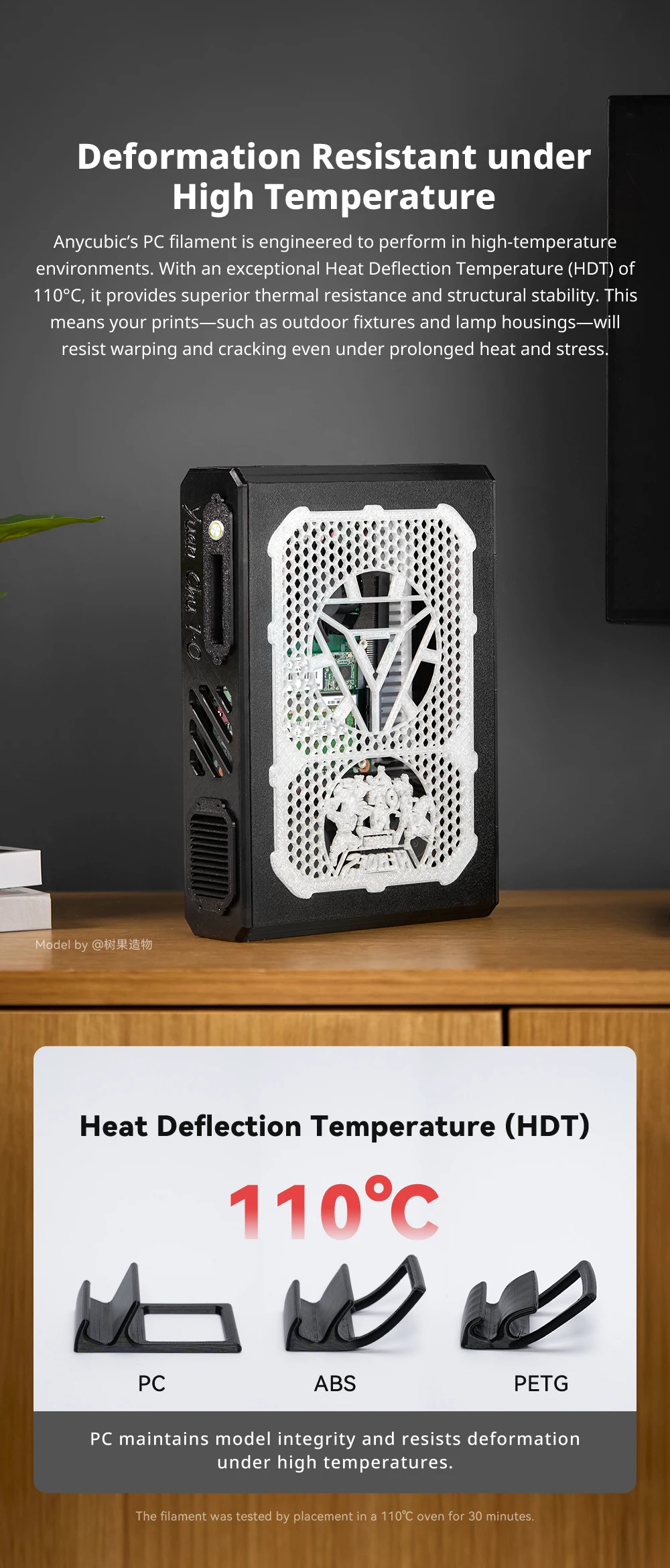 El filamento de PC de Anycubic está diseñado para funcionar en entornos de alta temperatura.Con una temperatura excepcional de desviación de calor (HDT) de 110°C, proporciona resistencia térmica y estabilidad estructural superiores.Esto significa que sus impresiones, como accesorios para exteriores y carcasas de lámparas, resistirán la deformación y el agrietamiento, incluso bajo calor y tensión prolongados.