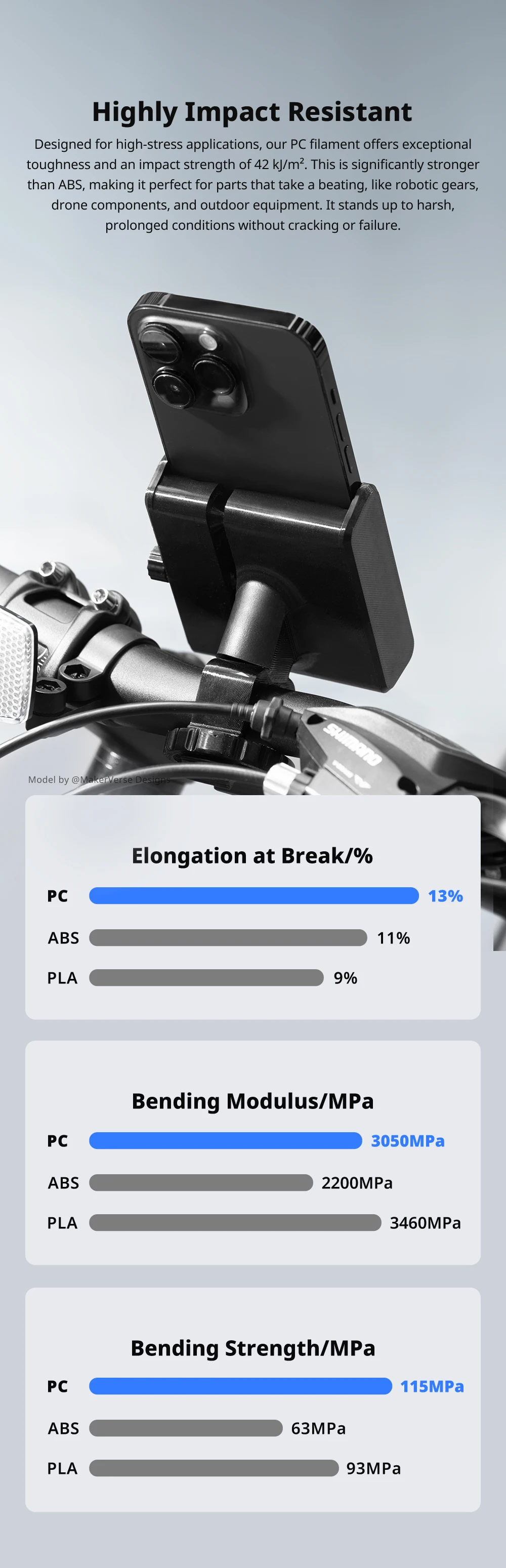 Diseñado para aplicaciones de alto estrés, nuestro filamento de PC ofrece una dureza excepcional y una resistencia al impacto de 42 kJ/m2.Esto es significativamente más resistente que el ABS, lo que lo hace perfecto para piezas que soportan golpes, como equipos robóticos, componentes de drones y equipos para exteriores.Resiste condiciones duras y prolongadas sin grietas ni fallas.