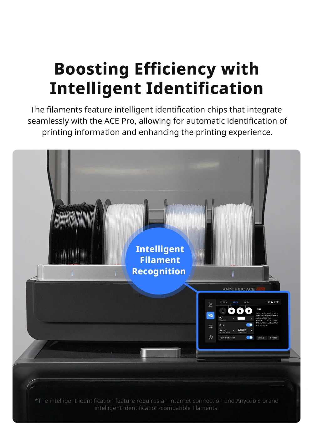 Los filamentos cuentan con chips de identificación inteligentes que se integran perfectamente con el ACE Pro, lo que permite la identificación automática de la información de impresión y mejora la experiencia de impresión.