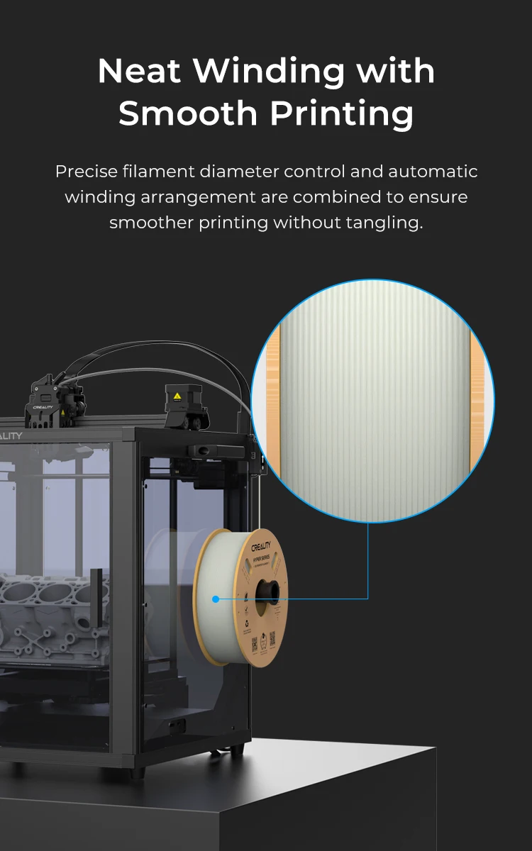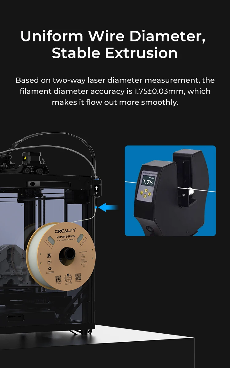 【Precisión y consistencia dimensionales】Diámetro de alambre uniforme de 1,75 mm del filamento Hyper PLA de Creality oficial, extrusión estable. Basado en la medición del diámetro del láser bidireccional, la precisión del diámetro del filamento es de 1,75 ± 0,02 mm, lo que hace que fluya más suavemente.
