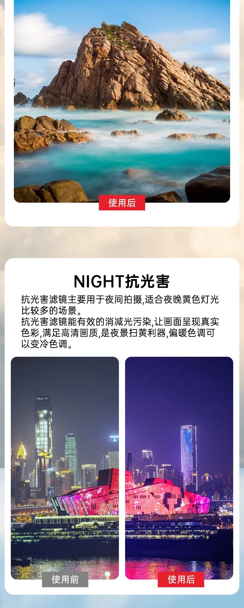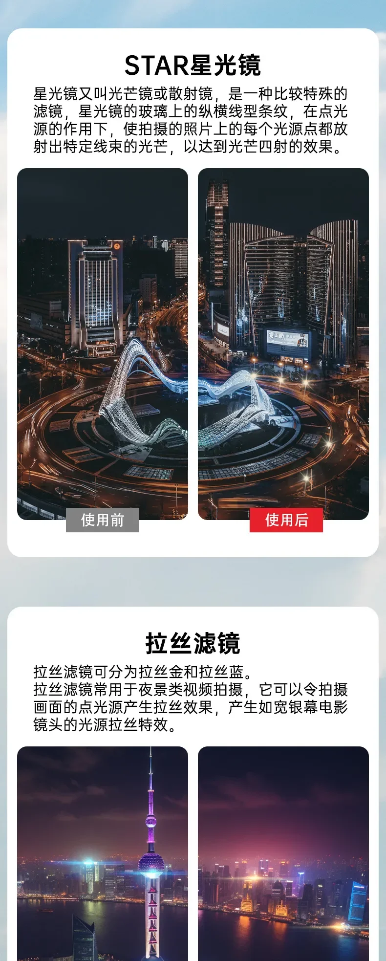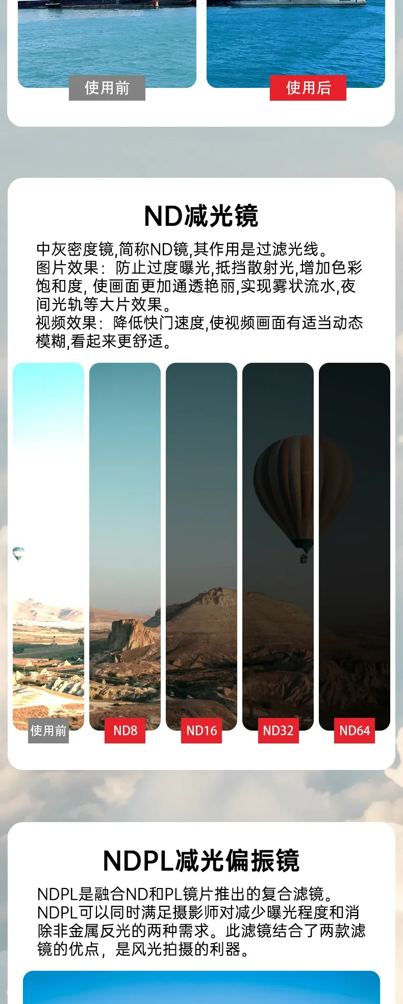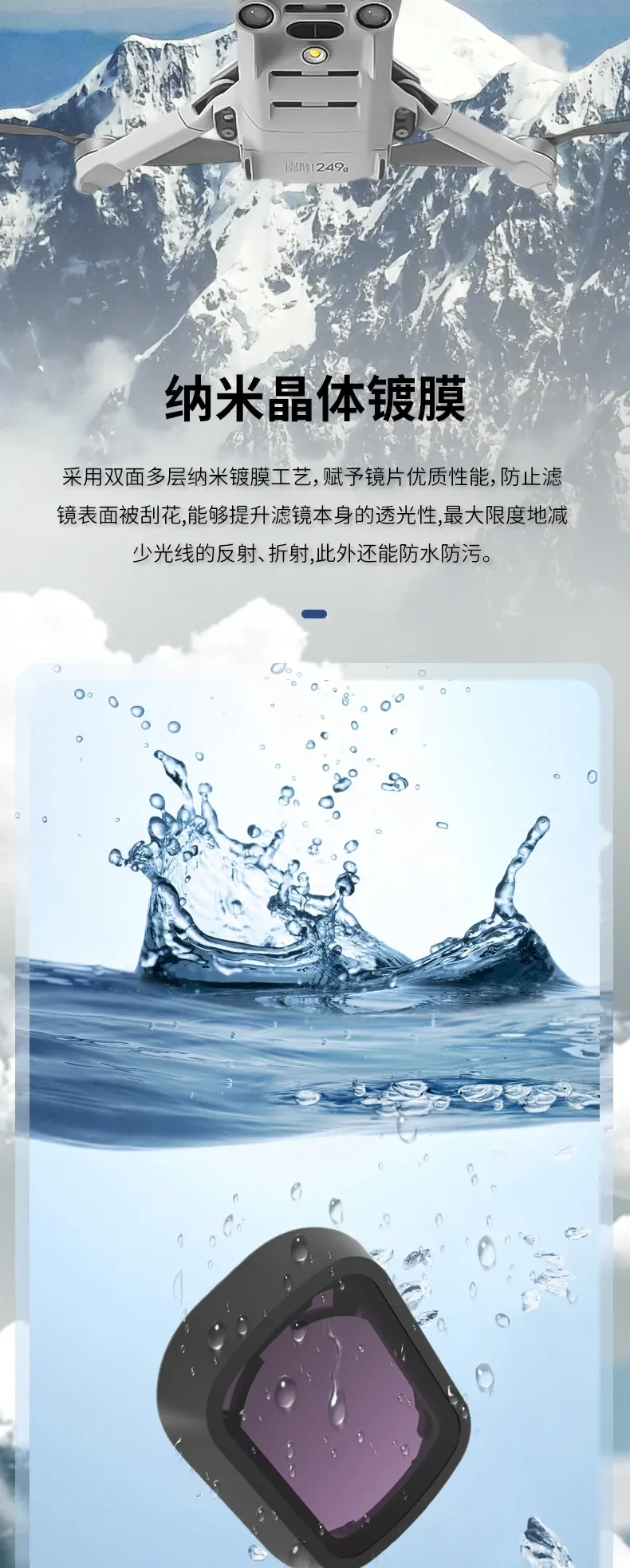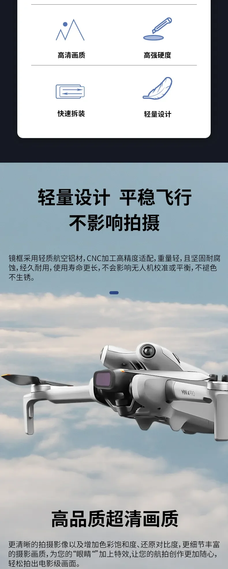 "Características: 1. Espejo de protección UV: El espejo UV, también conocido como filtro UV (ultravioleta), protege la lente y mejora la calidad de la imagen. Se utiliza para fotografiar en la playa, montañas, campos de nieve y áreas abiertas, etc. Puede reducir el tono azul causado por los rayos ultravioleta. También puede eliminar la interferencia de los rayos ultravioleta en el CCD, lo que ayuda a mejorar el efecto de nitidez y reproducción del color. 2. Filtro CPL: El filtro CPL, también conocido como Polarizador Circular, se utiliza principalmente para eliminar la luz dañina reflejada no metálica, aumentar la concentración de color, profundizar el cielo azul, resaltar las nubes blancas, hacer que la imagen sea más transparente, y mejora la claridad y expresividad de la imagen. También se utiliza a menudo para grabar escenas detrás de un cristal, agua clara y transparente y criaturas subacuáticas. Al usarlo, debe prestar atención al ajustar el ángulo del filtro. Szkoston. 3. Filtro ND: Imagen: ambiente de luz fuerte, evita la sobreexposición, resiste la luz dispersa, aumenta la saturación de color y hace que la imagen sea más transparente y brillante. Realice efectos a gran escala, como agua que fluye como niebla y seguimiento de luz nocturna. Vídeo: disminuye la velocidad de obturación para que la imagen de vídeo tenga un desenfoque de movimiento adecuado y se vea más cómoda. 4. Filtro NDPL: Una herramienta para fotografía de paisajes. Combina las ventajas de la reducción de luz ND y El polarizador PL. Elimina reflejos, aumenta la saturación, mejora el contraste y hace que la imagen sea más tridimensional y transparente. Disminuye la velocidad de obturación. Extienda el tiempo de exposición para evitar la sobreexposición. 5. Filtro nocturno: Filtro anticontaminación lumínica, que puede reducir eficazmente la contaminación lumínica y hacer que la imagen muestre un color real 6. Filtro de estrella: El espejo de estrella es un lugar donde la luz es relativamente brillante, y habrá un efecto de estrella. Generalmente se utiliza por la noche. Peso: 1,6G Tamaño: 22*18*3,8mm Nombre: adecuado para DJI Mini 4 Pro Material: aluminio metálico de aviación + vidrio óptico Modelo: Mezcla 3 en 1: CPL ND8 ND16 ND 3 EN 1: ND16 ND64 ND256 Mezcla 4 en 1: CPL ND16 ND32 ND64 6 En 1: UV CPL ND8 ND16 ND32 ND64 8 EN 1: CPL ND8 ND16 ND32 ND64 ND256 ND1000 Noche 12 EN 1: UV CPL ND8 ND16 ND32 ND64 ND256 ND1000 ND32PL ND64PL STAR Night Nota: los drones no están incluidos.