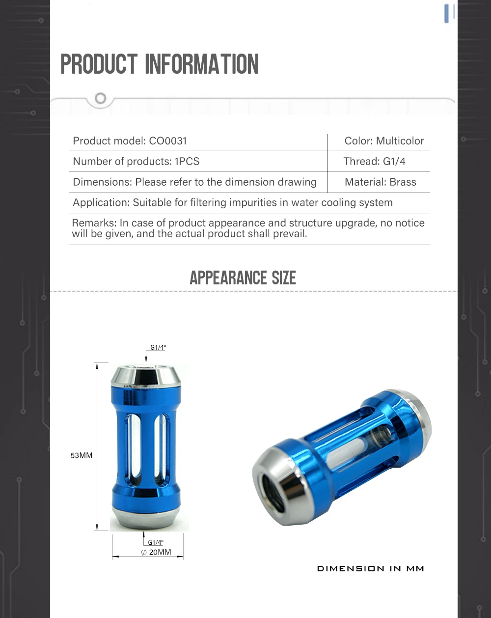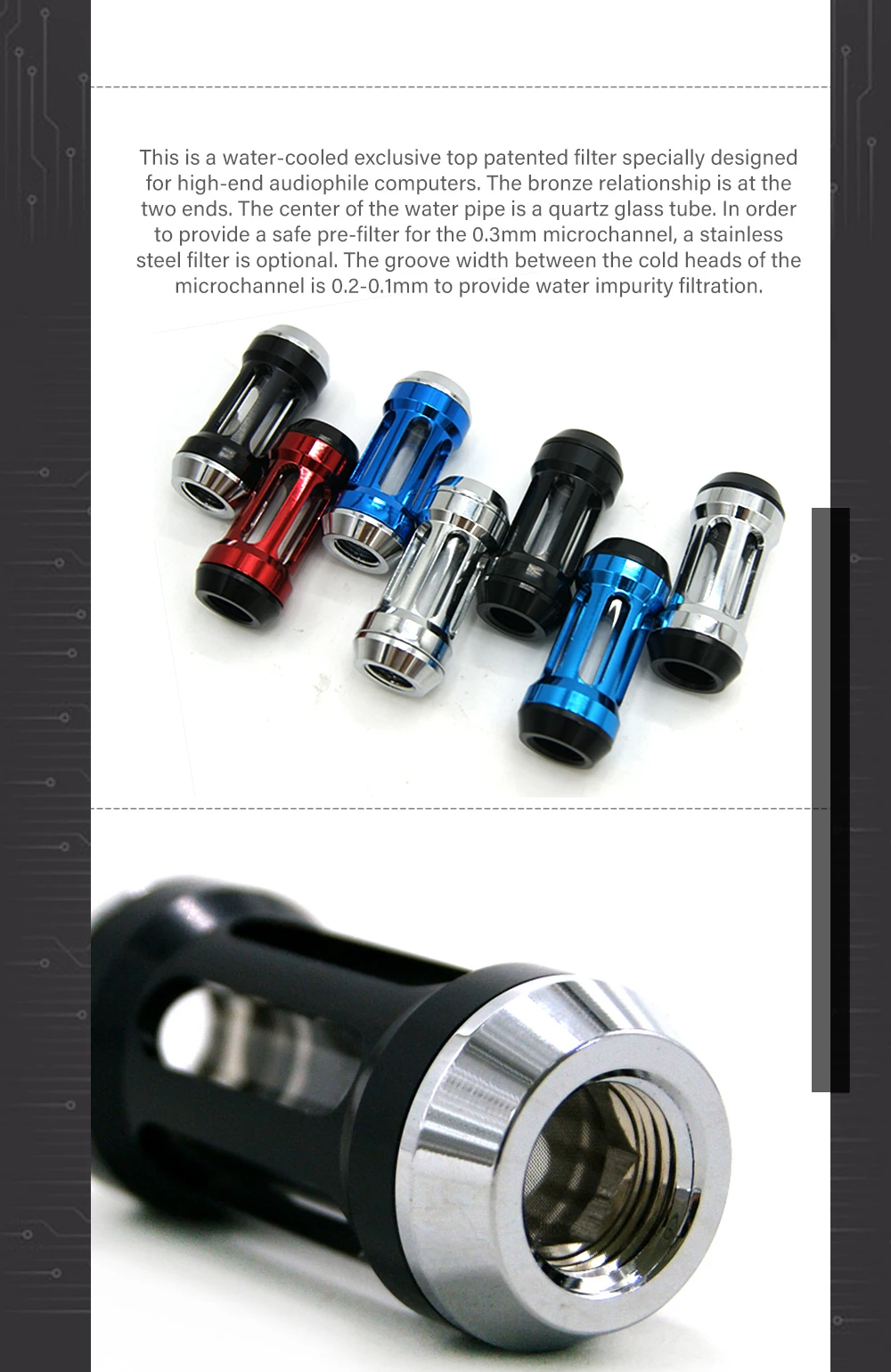 Este es un exclusivo filtro patentado de primera línea refrigerado por agua diseñado para computadoras de alta gama con nivel de fiebre. La interfaz de latón se encuentra en la interfaz de 2 terminales. El centro de la tubería de agua es un tubo de vidrio de cuarzo. Para el microcanal de 0,3 MM para proporcionar un prefiltro seguro, el FILTRO DE ACERO INOXIDABLE opcional se puede utilizar para un ancho de ranura de 0,2-0,1 MM entre el cabezal frío del microcanal para proporcionar filtración de impurezas de agua.