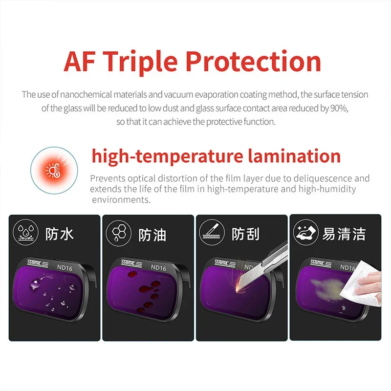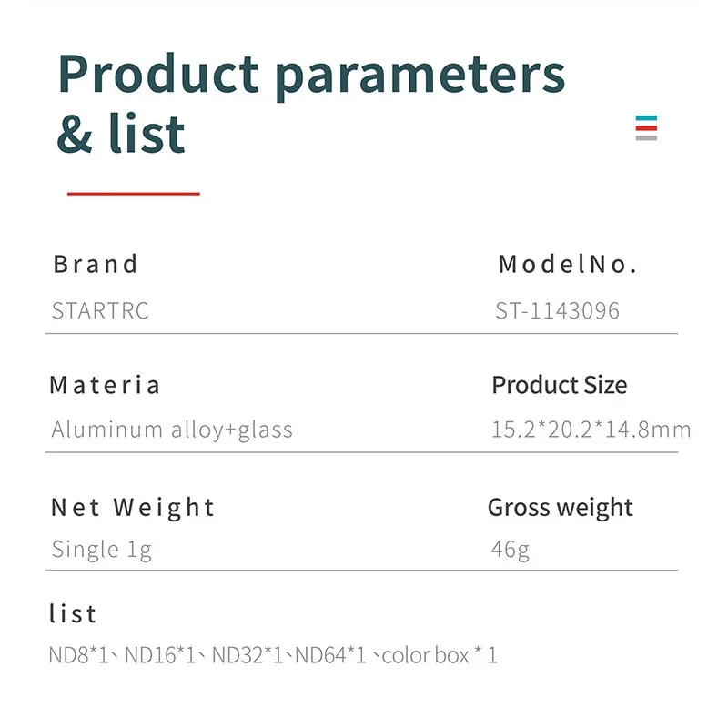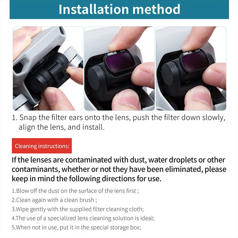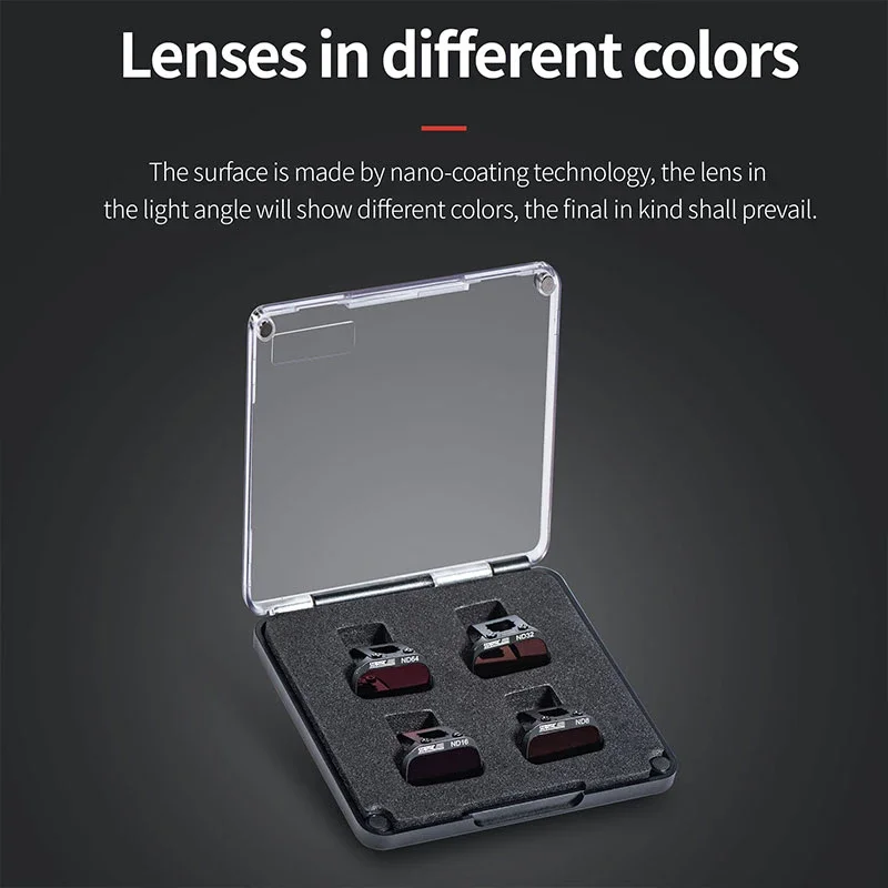 3.El marco de metal está grabado con láser con un acabado en negro mate para evitar fugas de luz o imágenes fantasma, lo que garantiza que cada filtro se pruebe rigurosamente y no agregará carga adicional a su cardán ni interfiera con el vuelo normal del dron, y que el peso individual sea solo 1 gramo.