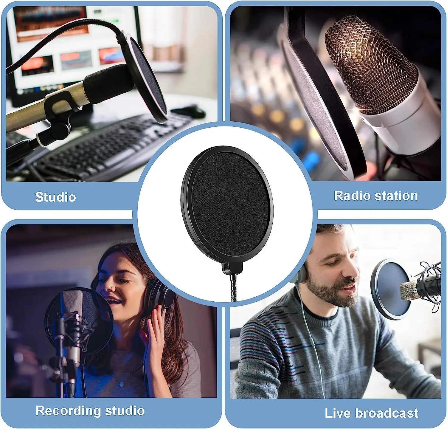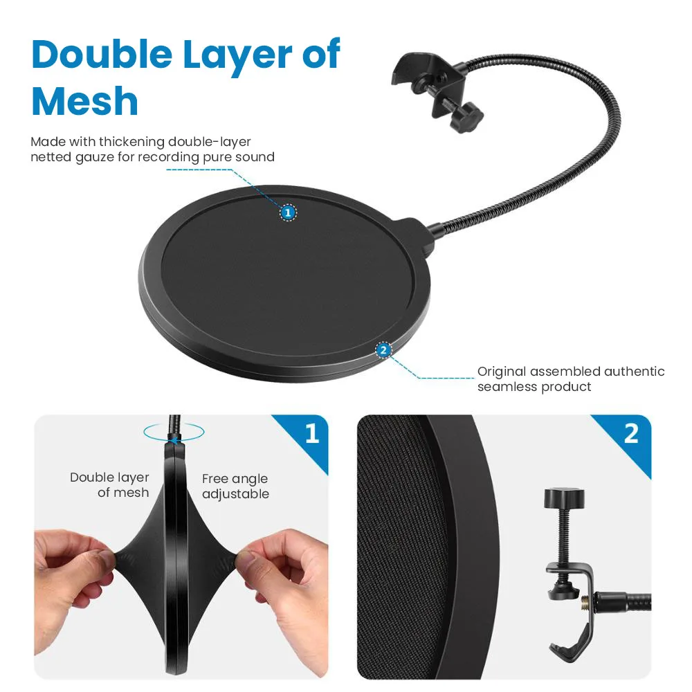 【Filtro pop de doble capa】-el filtro pop para micrófonos presenta capas dobles de malla de nailon, que pueden reducir eficientemente los explosivos, la interferencia del viento y la pulverización de saliva durante la grabación o la transmisión, y ayudar a los usuarios a obtener un sonido claro y fuerte.