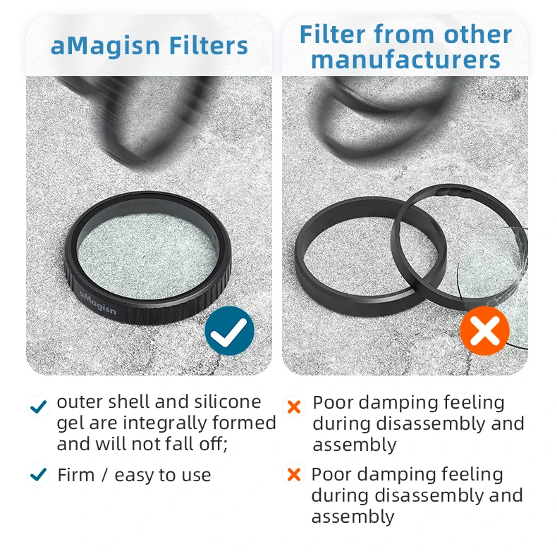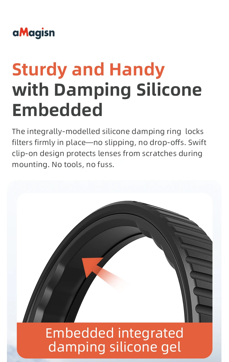 Conecte y retire los filtros sin esfuerzo utilizando el anillo amortiguador de silicona integrado.Garantiza un ajuste estable y antideslizante en las lentes, incluso durante disparos rápidos.Compatible con la mayoría de los protectores de lentes, no se requieren herramientas ni ajustes.