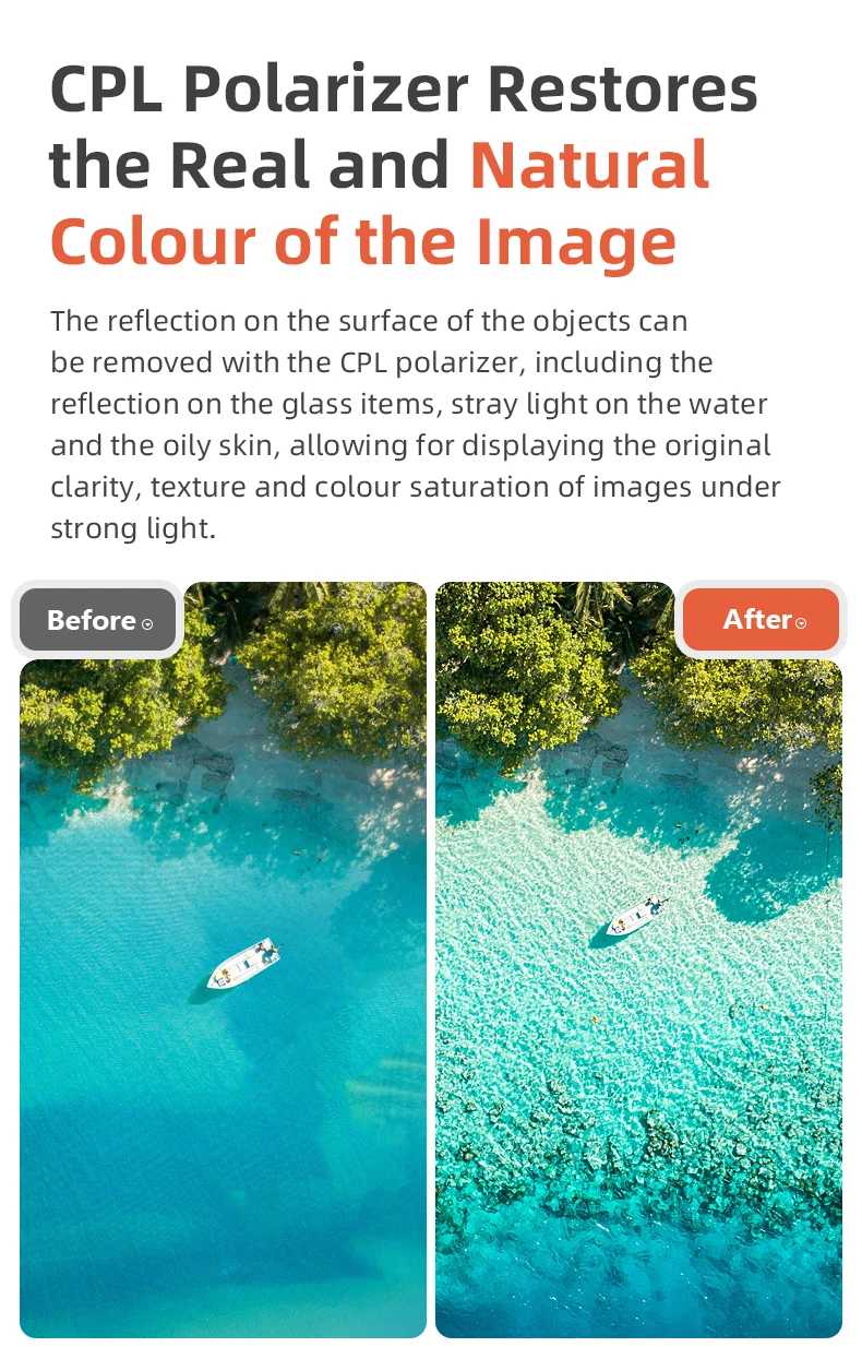 Polarizador CPL: Elimine los reflejos en el agua, el vidrio o las superficies brillantes mientras mejora la saturación del color.