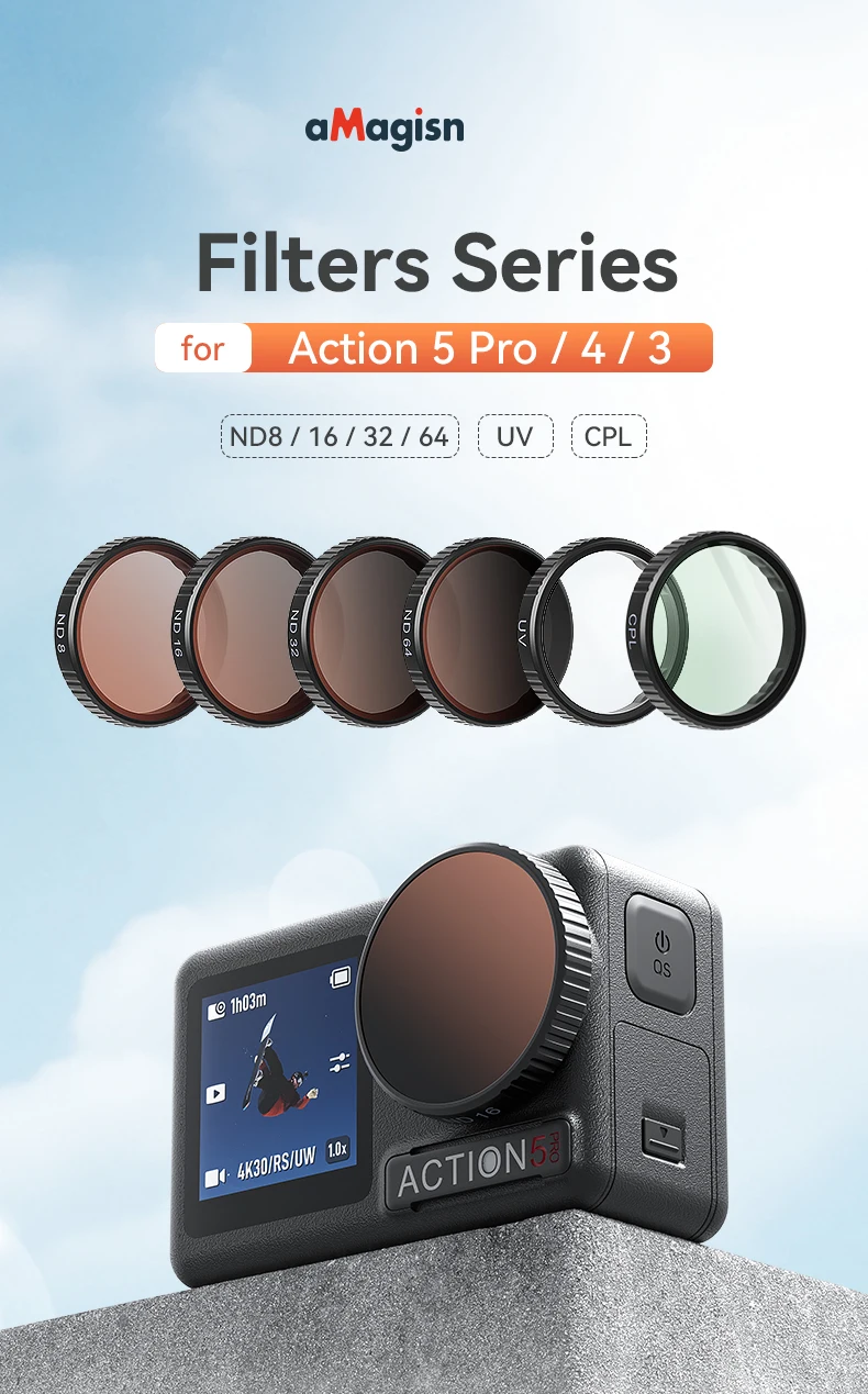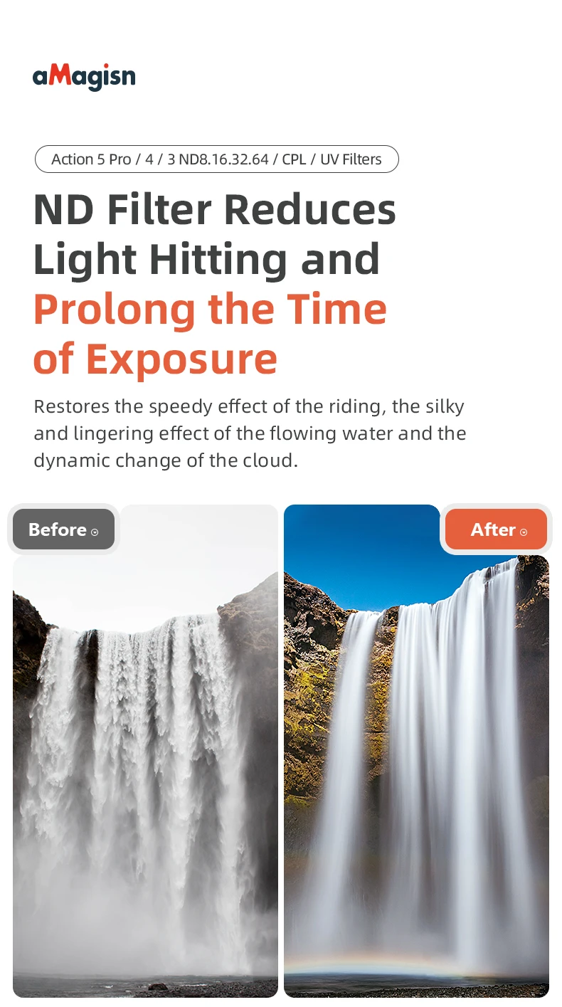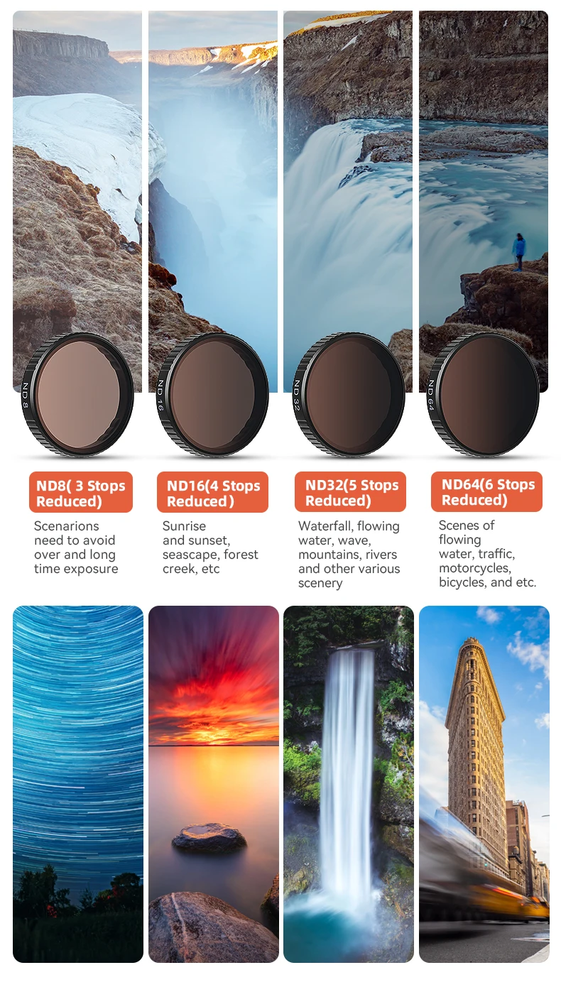 Filtros ND (ND8/16/32/64): Maestro de largas exposiciones para cascadas sedosas, nubes borrosas con movimiento y paisajes urbanos brillantes.