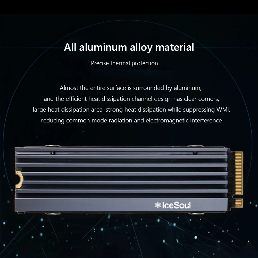 Diseño multicanal para la disipación del calor, más eficiente. El material de aleación de aluminio, la estructura de disipación de calor de la carcasa de textura cóncava-convexa, la lectura y escritura rápidas de datos pueden suprimir el aumento de temperatura del SSD, puede activar el límite de velocidad de la ranura caliente (para evitar que el SSD se sobrecaliente) y mantener un rendimiento estable del SSD.