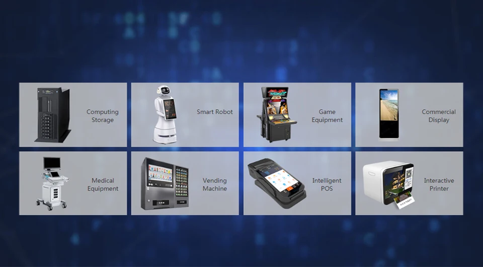 AIO-3288C se puede aplicar directamente a una variedad de productos.Como almacenamiento informático, robot inteligente, equipo de juegos, exhibición comercial, equipo médico, máquina expendedora, POS inteligente, impresora interactiva, etc.