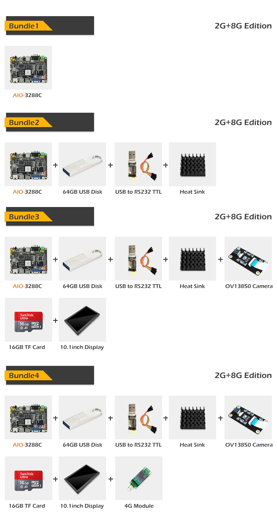 Paquete 4:2 GB + 8 GB AIO-3288C + Disco USB de 64 GB + USB a RS232 TTL + Disipador de calor + Cámara OV13850 + Tarjeta TF de 16 GB + LCD táctil de 10,1 pulgadas + Módulo 4G