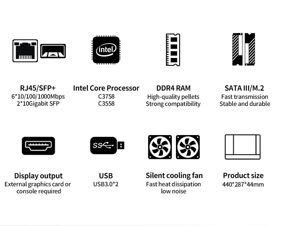Impulsado por procesadores Intel Atom C3758/C3808/C3958 con cifrado de hardware AES-NI, este aparato de montaje en rack 1U ofrece un rendimiento robusto de firewall para pfSense®, OPNsense®y soluciones basadas en Linux/BSD.El soporte UEFI garantiza la compatibilidad moderna con el sistema operativo.