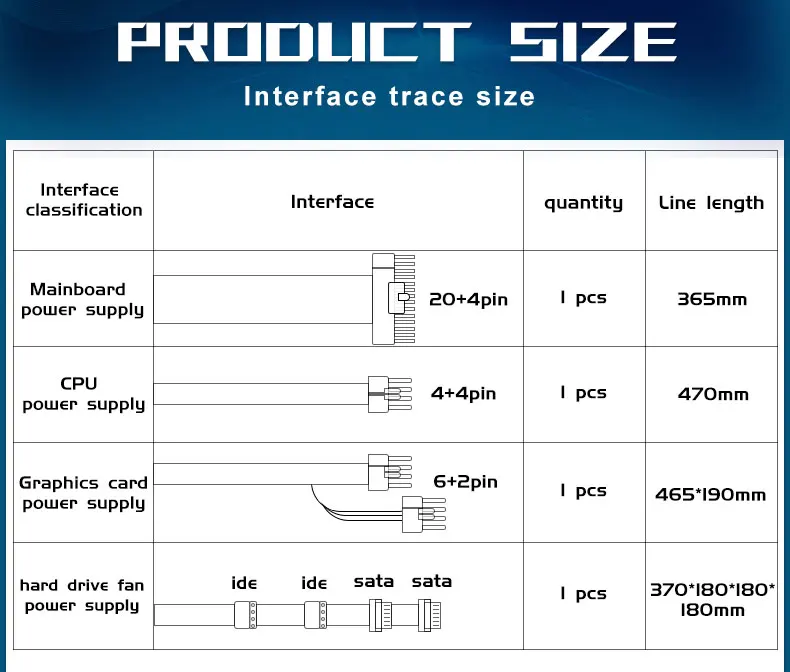 Potencia total: 500 W, máximo 600Tipo de ventilador: ventilador 4020 de 2 pinesVoltaje de entrada: 90-265vAlta eficiencia: 85%Tamaño: (150+23)*81,5*40mmConector :6 pines a 6+2 pines *14 pines a sata a IDE *14 pines a 4+4 pines *114 pines a 20+4 pines *1Característica:• De acuerdo con Intel ATX 12V versión 2.31• Alta eficiencia• Bajo ruido de ondulación de salida• Cada salida con protección contra sobretensión• Cada voltaje de salida con protección contra cortocircuitos• Ventilador PWM de 4020 CM• Prueba de envejecimiento 100% a alta temperatura (50℃)• Ciclo de vida: más de 80KH horas