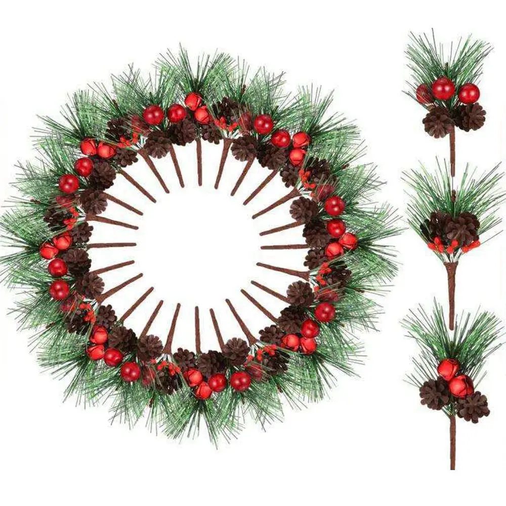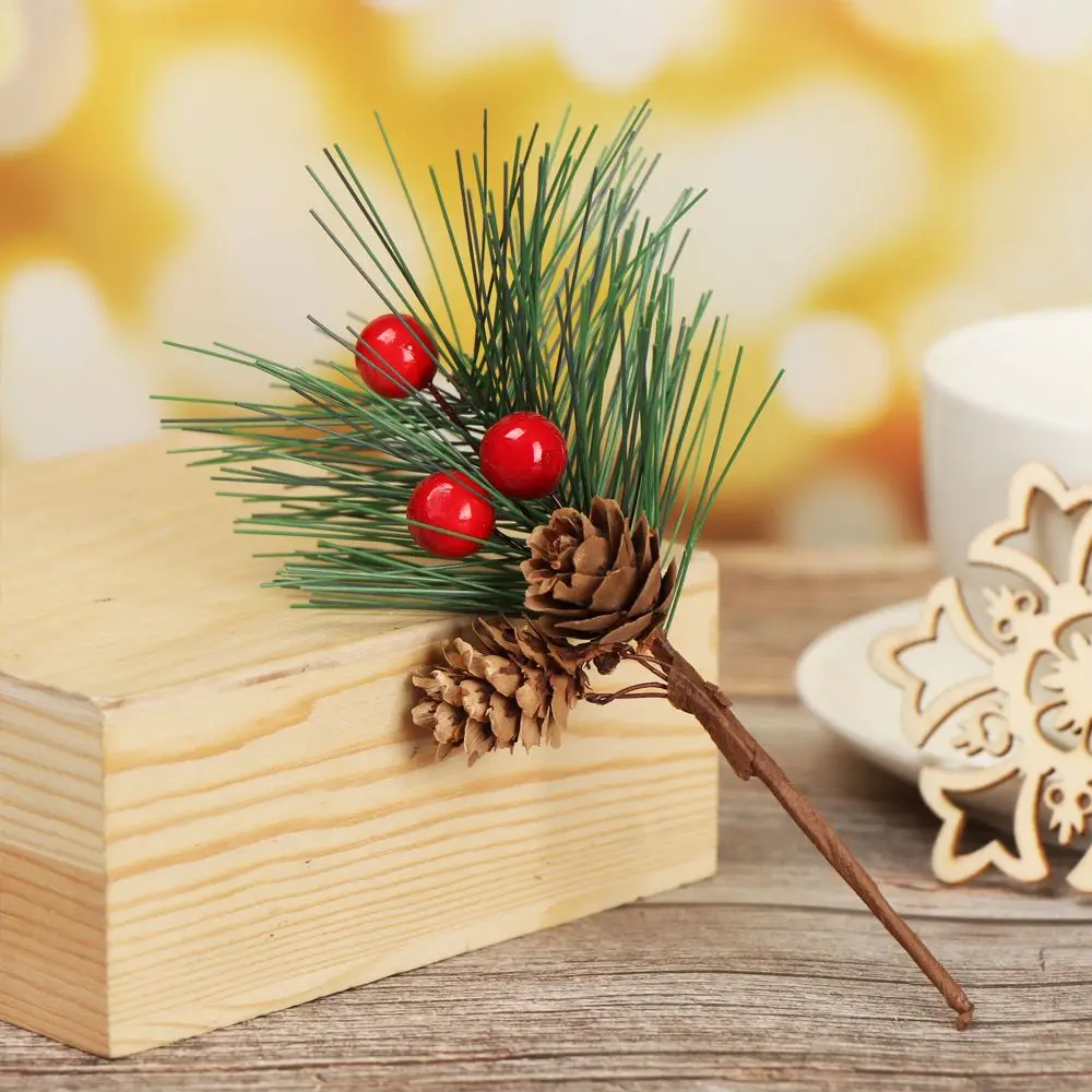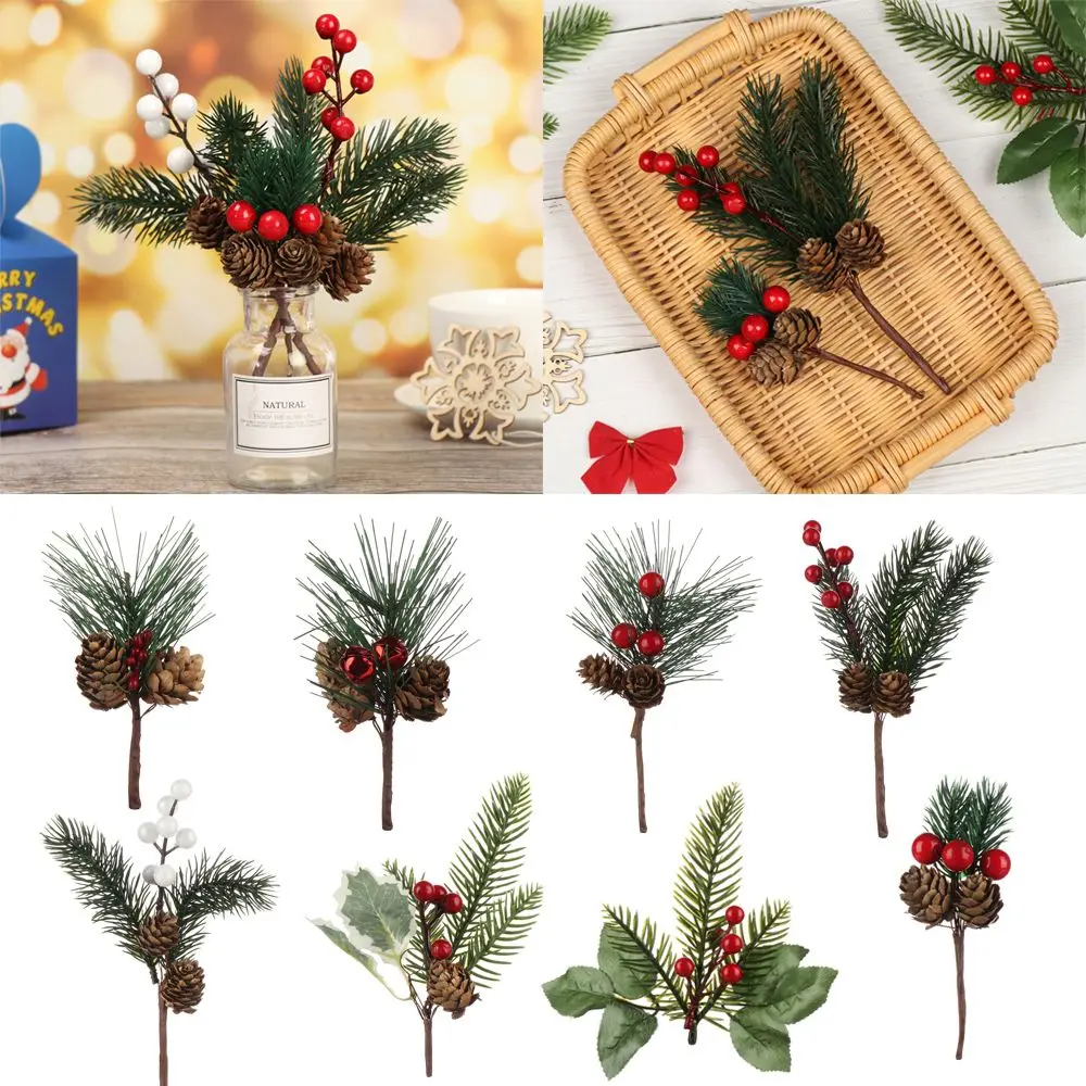 Comprar Flor Artificial roja navideña, cono de bayas y ramas de pino con acebo, decoración navideña para el hogar, artesanías florales