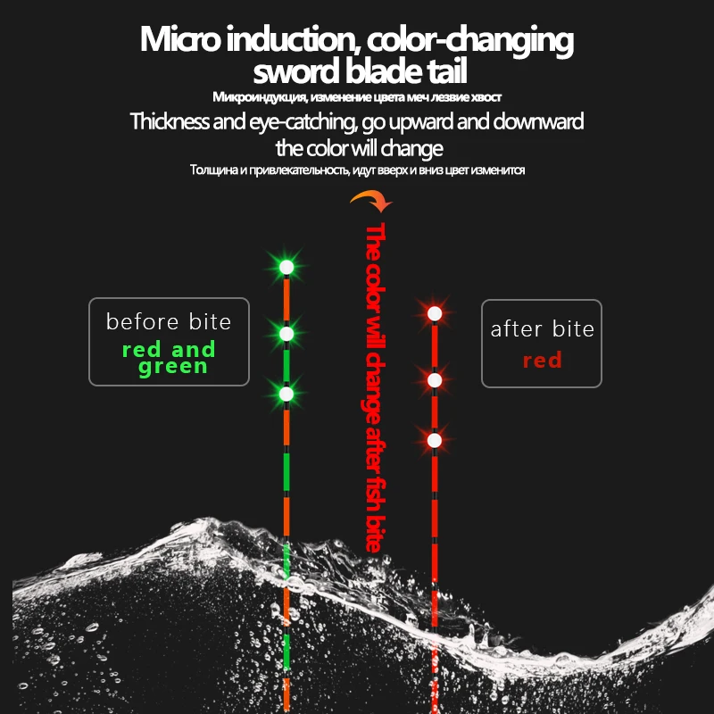 2. La cola del flotador cambiará de color cuando el flotador vaya hacia abajo y hacia arriba, lo que significa que el pez muerde el anzuelo e intente escapar, pero la cola del flotador no cambiará de color si el flotador se mueve hacia adelante y hacia atrás por el viento.
