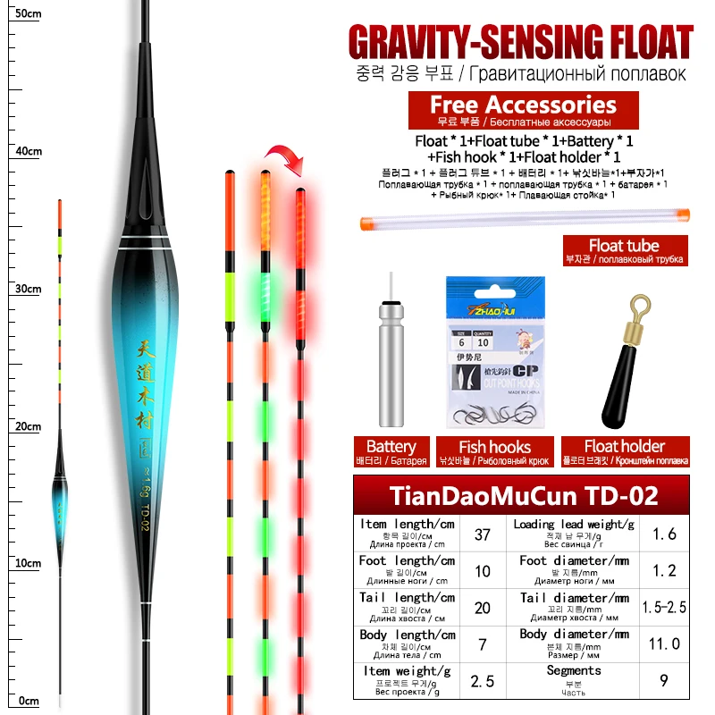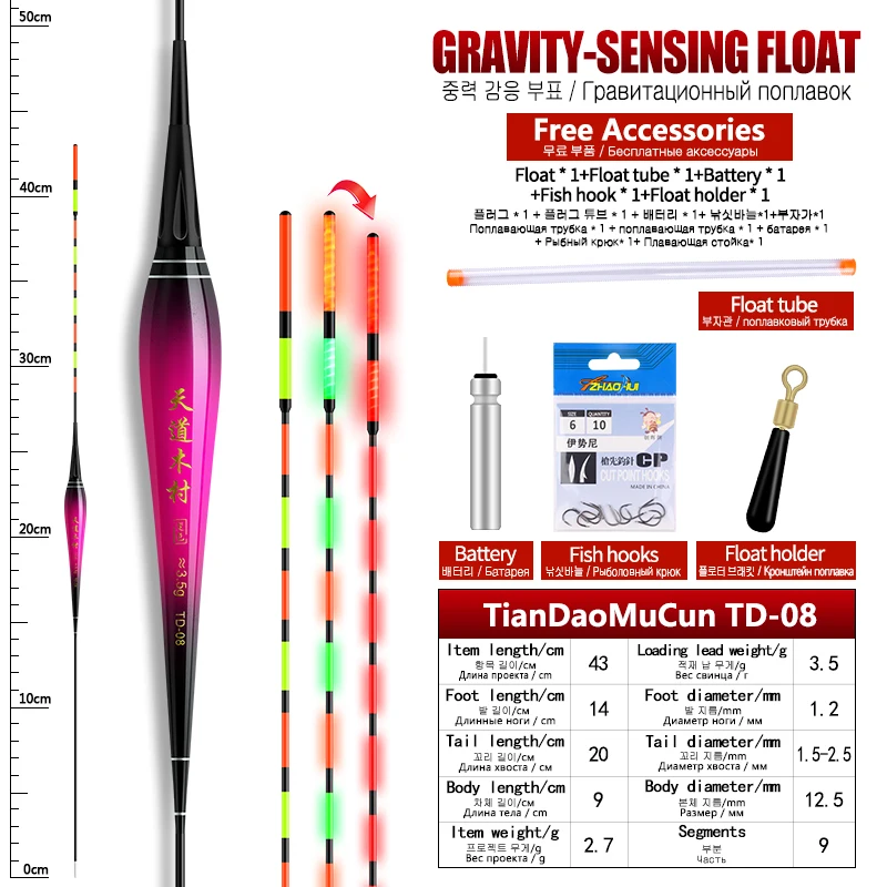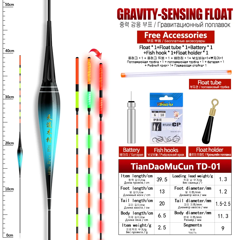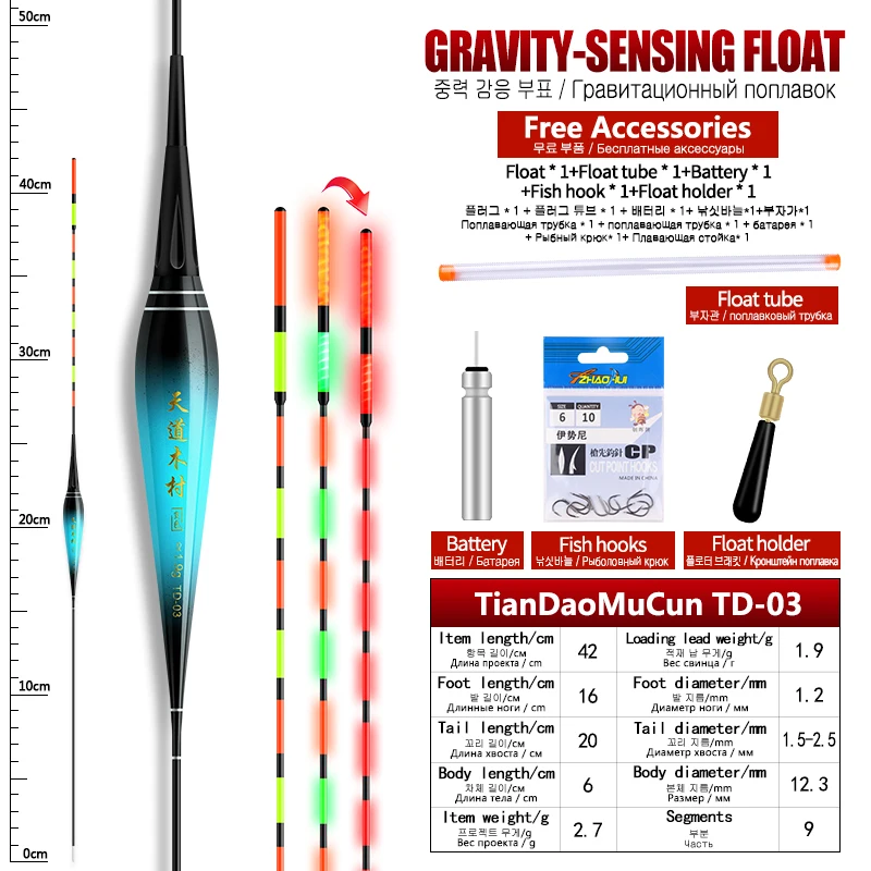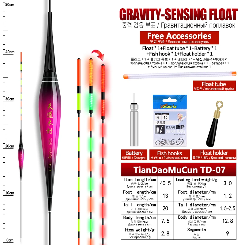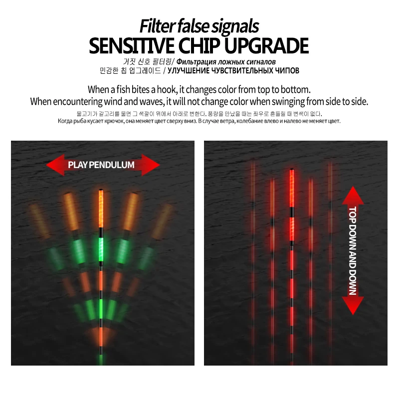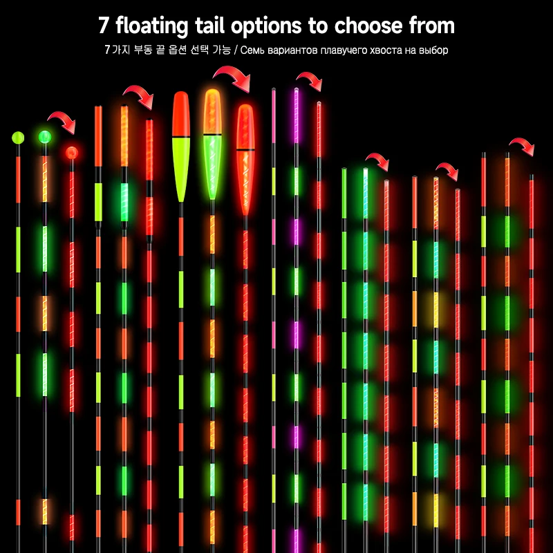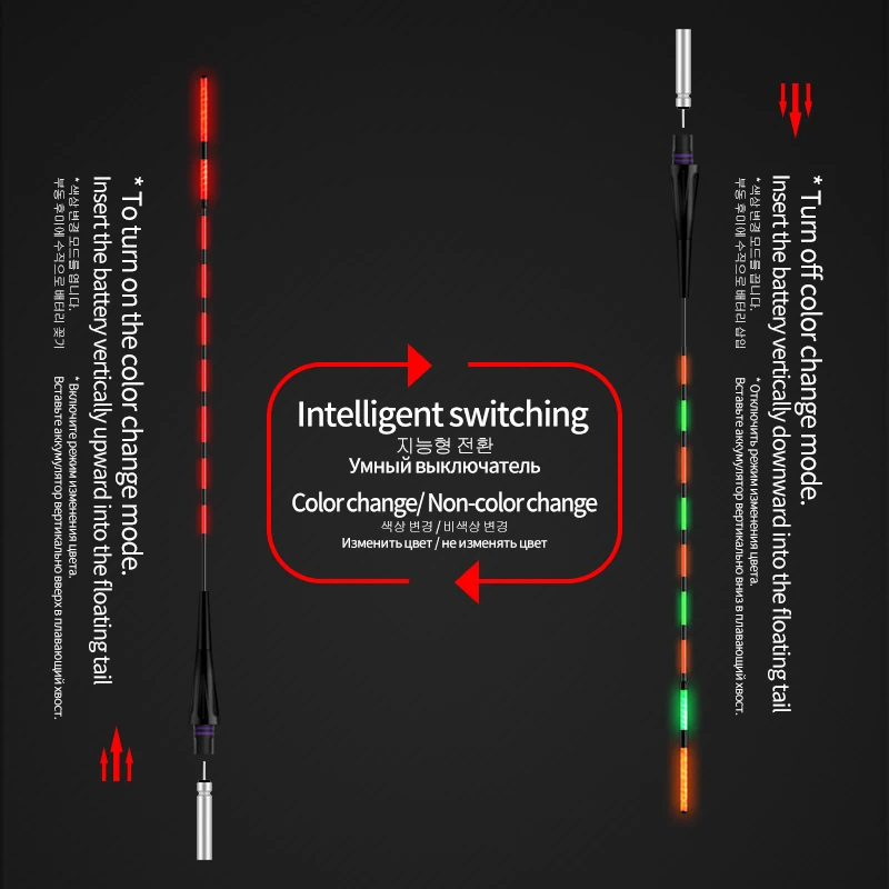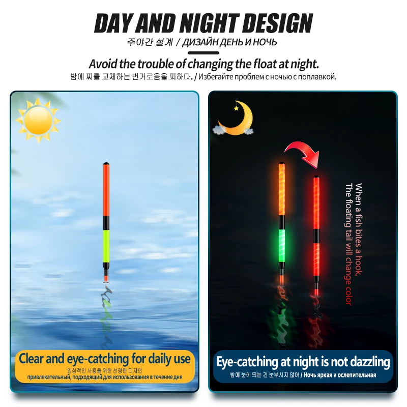 Características:1. La cola flotante es un sensor de gravedad, que puede cambiar de color cuando los peces muerden los anzuelos de pesca.2. El flotador está hecho de nanomaterial de alta calidad, que hace que los flotadores sean duraderos.