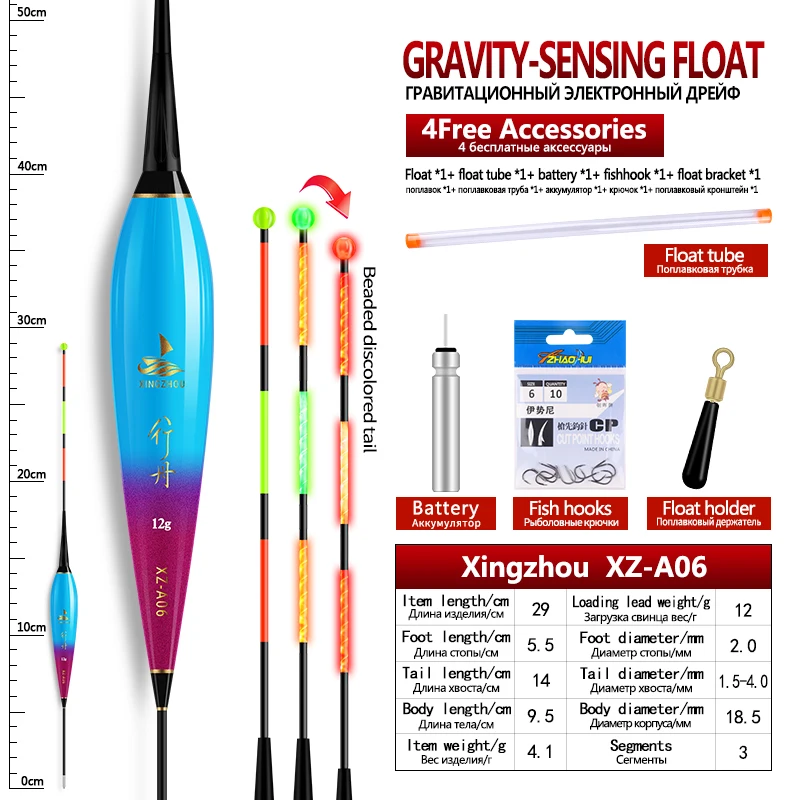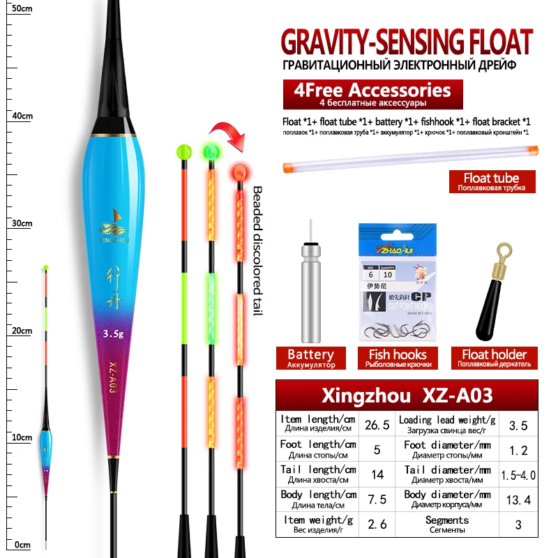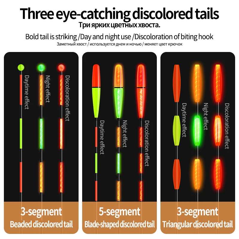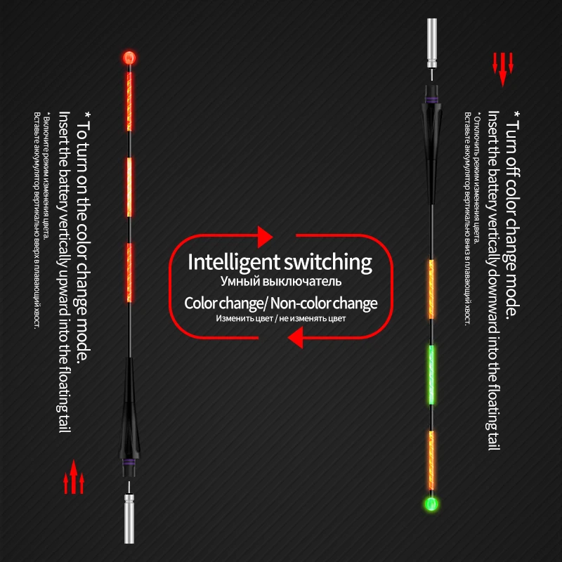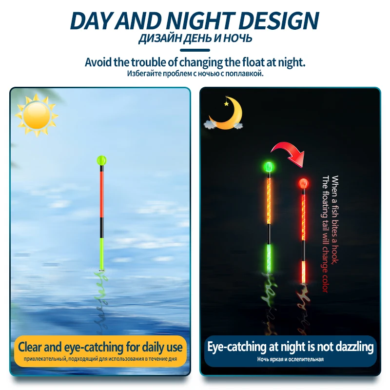 1, The float tail is designed gravity sensor, which can change color when fish bite the hook while fishing.