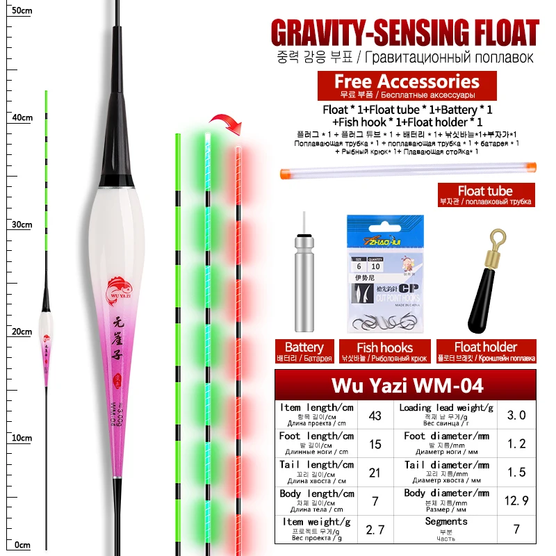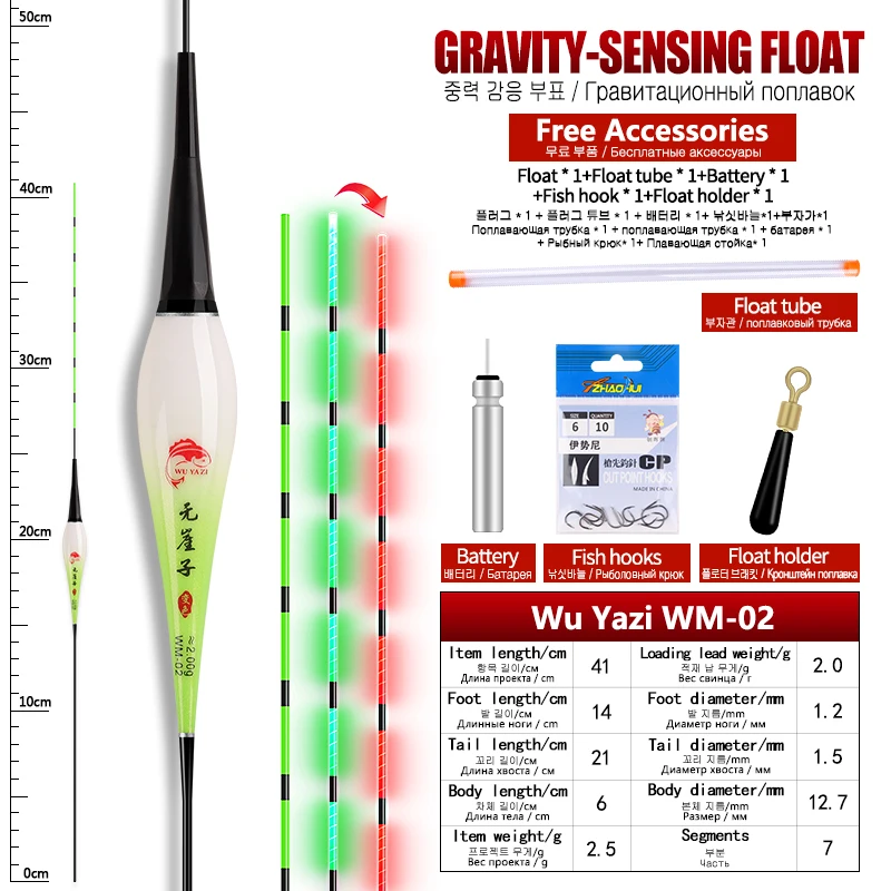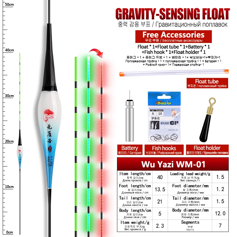 Características:1. La cola del flotador es un sensor de gravedad, que puede cambiar de color cuando el pez muerde los anzuelos de pesca.2. El flotador está hecho de nanomaterial de alta calidad, que hace que los flotadores sean duraderos para su uso.