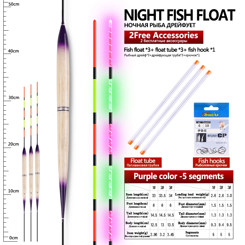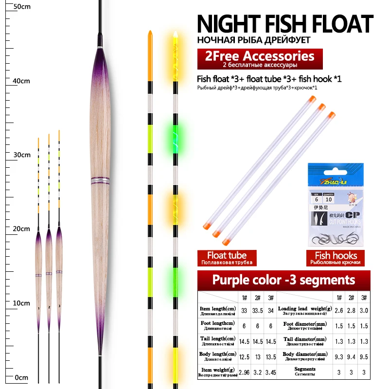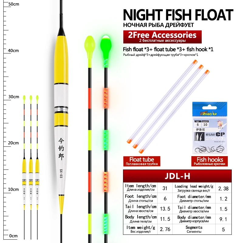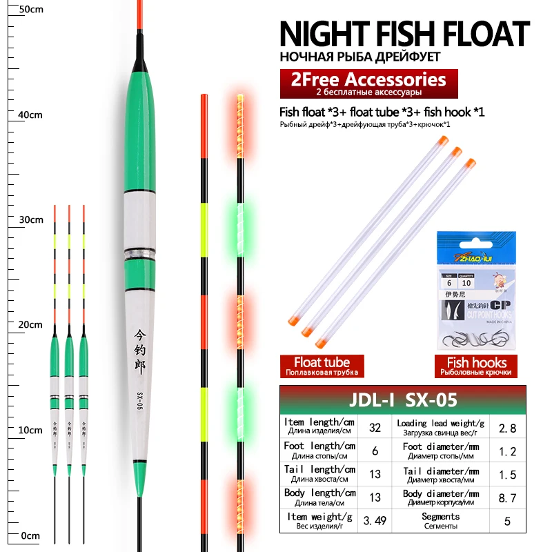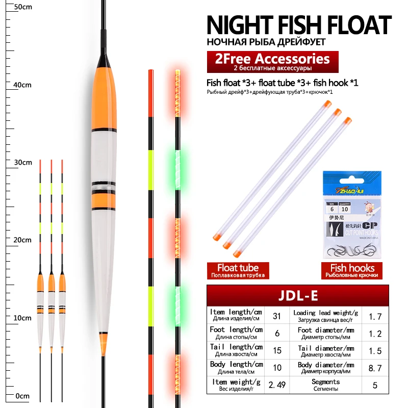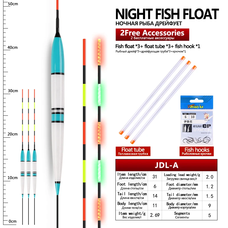 Comprar Flotadores luminosos de luz nocturna, 3 tubos flotantes, 1 bolsa de ganchos de regalo, dos modelos, herramientas de tapón de pesca de Lago y río sin batería, 3 uds./lote