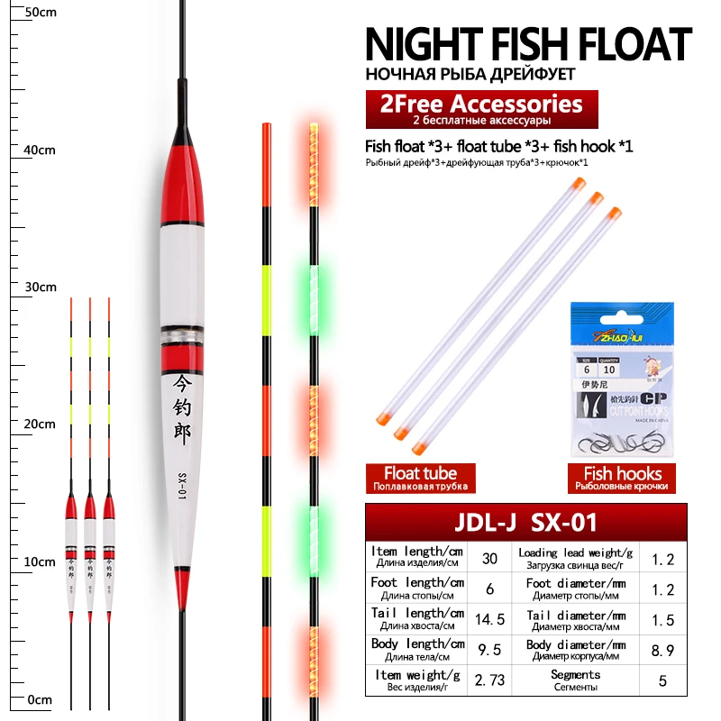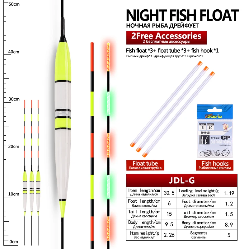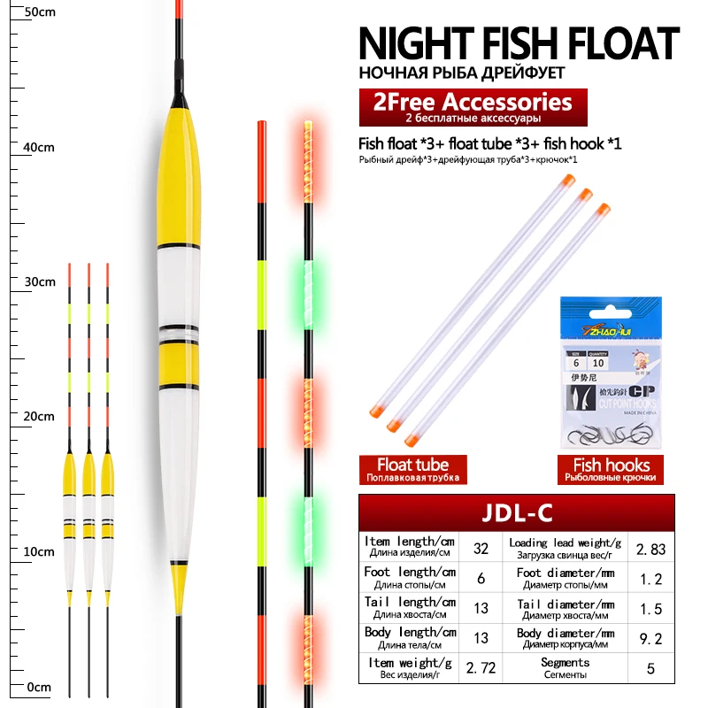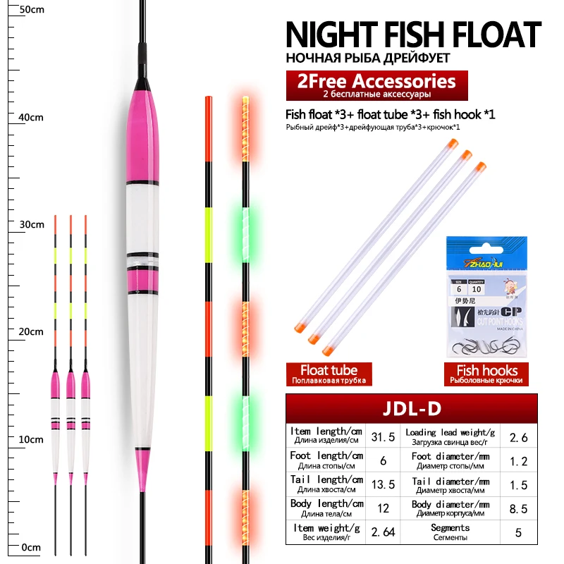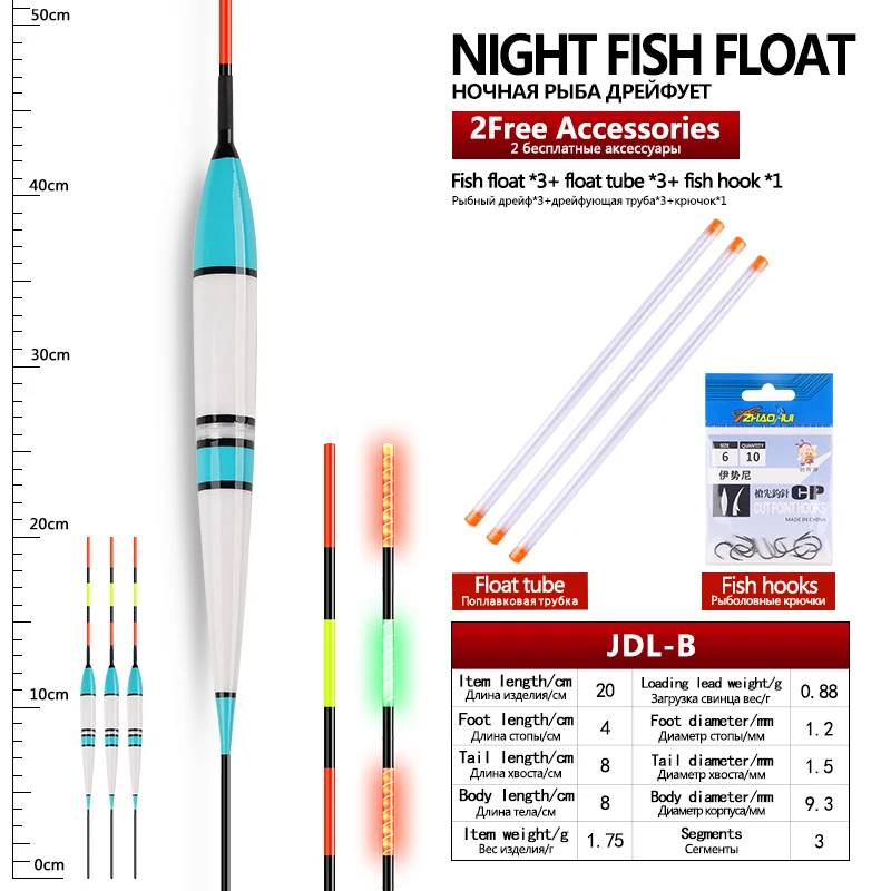 Comprar Flotadores luminosos de luz nocturna, 3 tubos flotantes, 1 bolsa de ganchos de regalo, dos modelos, herramientas de tapón de pesca de Lago y río sin batería, 3 uds./lote