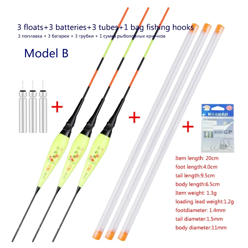 Flotadores de pesca de 3 piezas + baterías de 3 piezas + tubos de flotador de 3 piezas + anzuelos de pesca de 1 bolsa