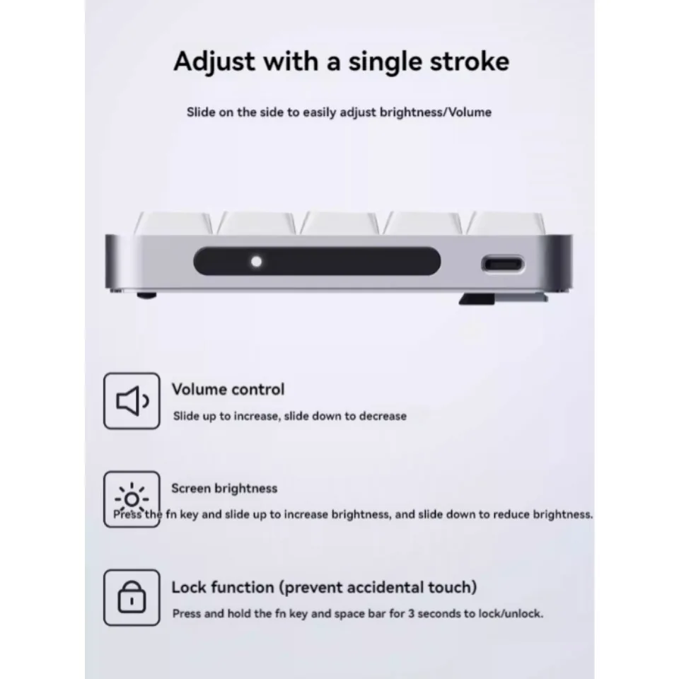 FunciónCómodo ajuste de la barra táctil lateral- Ajuste fácilmente el brillo y el volumen de la pantalla con una sola carrera deslizando la barra táctil lateral.También puede bloquear/desbloquear el teclado para evitar toques accidentales presionando y manteniendo presionada la tecla fn y la barra espacial durante 3 segundos.