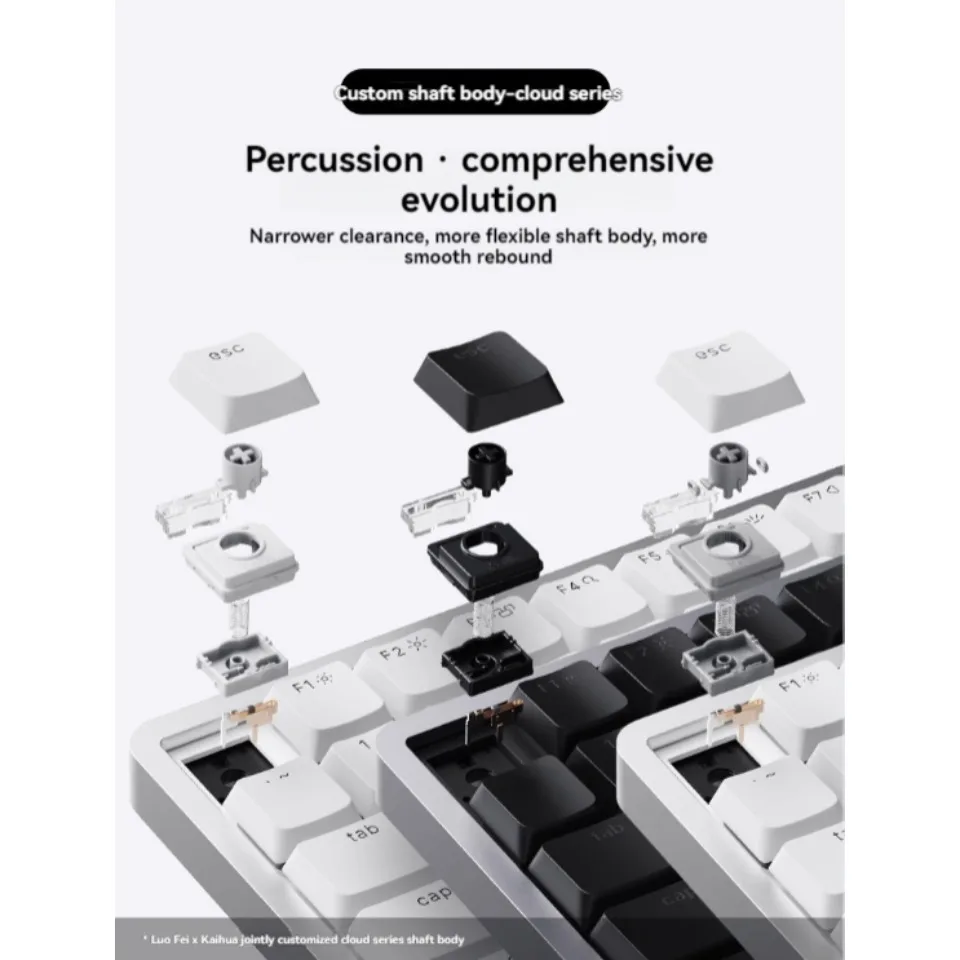 Cuerpo del eje de la serie ustom Cloud- Equipado con un cuerpo de eje de la serie de nubes personalizado conjuntamente (en colaboración con Kailh), que tiene espacios más estrechos, un cuerpo de eje más flexible y un rebote más suave para una experiencia de percusión evolucionada