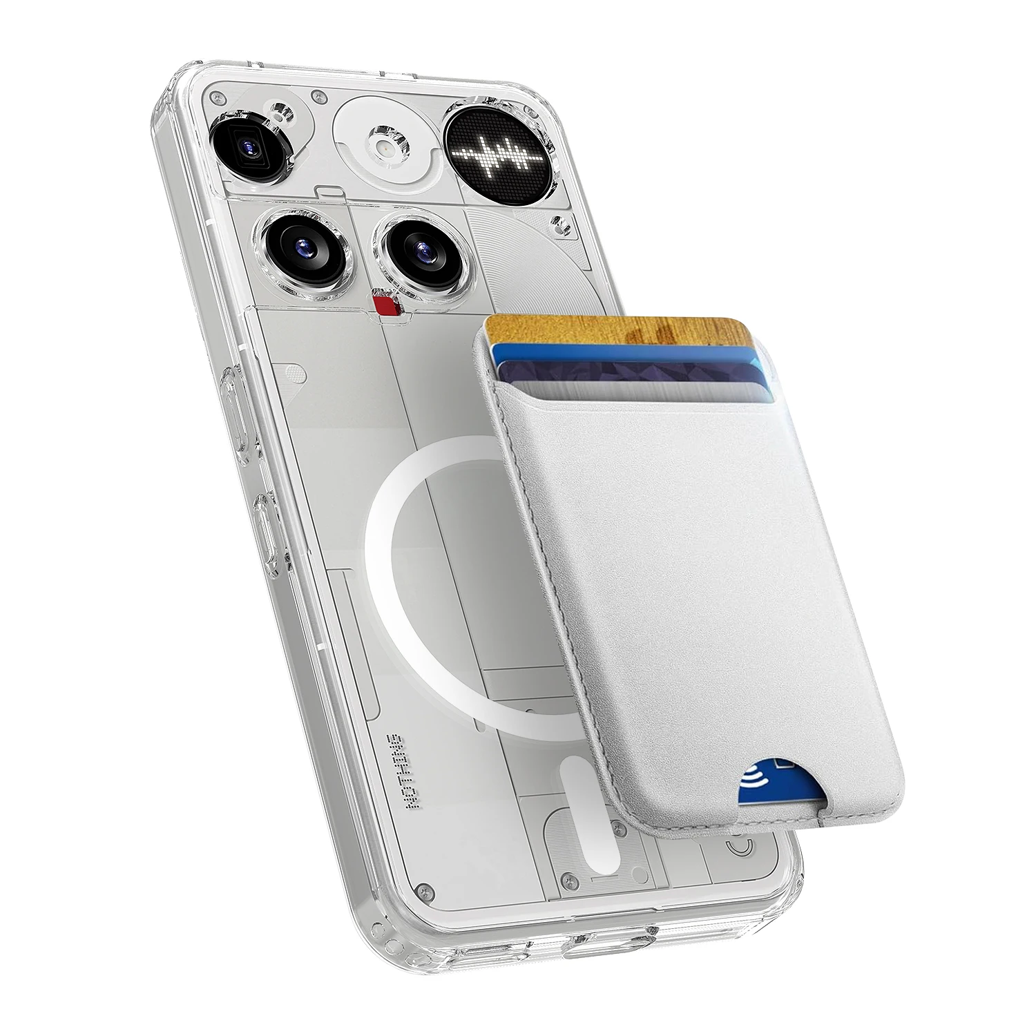 La funda encaja perfectamente. Un poco más pesado de lo esperado, pero con bordes gruesos para mayor protección, por lo que el peso tiene sentido. Los imanes tienen una fuerza aceptable, pero si aún deseas utilizar la matriz de glifos, no añadas ningún accesorio MagSafe.