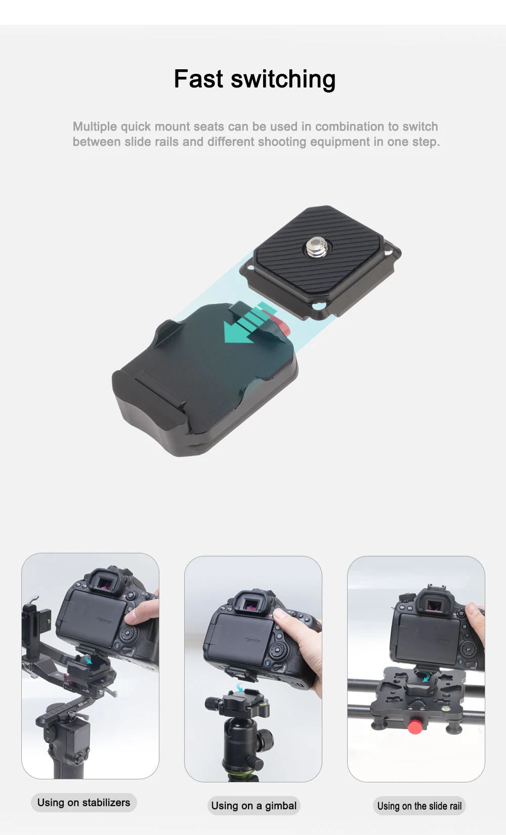 Uso de combinación de montaje rápido: múltiples combinaciones de montaje rápido pueden lograr un cambio de un paso entre diferentes posiciones de cámara en el tobogán y el trípode, así como entre diferentes equipos de disparo. Mejora en gran medida la eficiencia del trabajo de los fotógrafos.