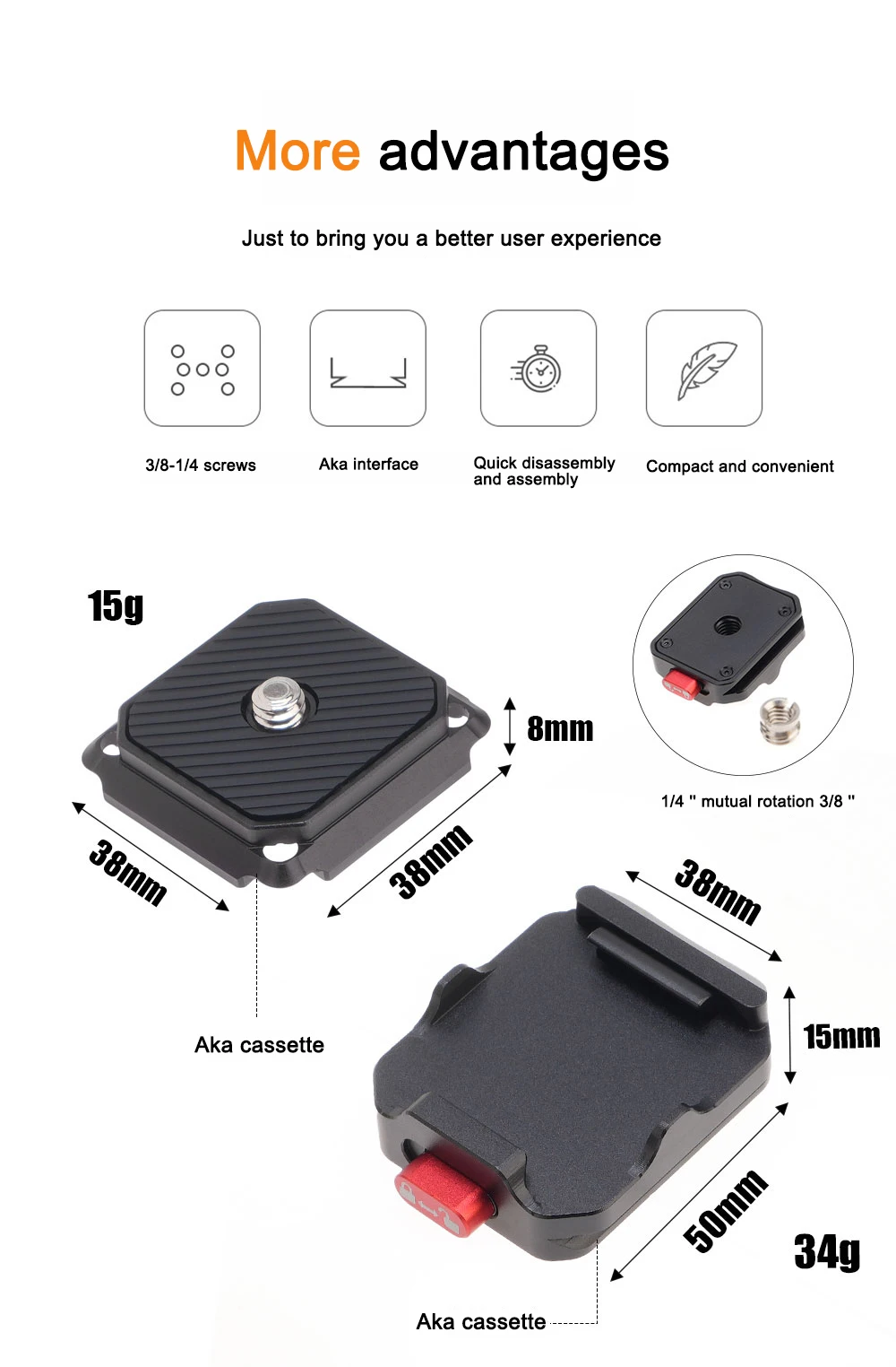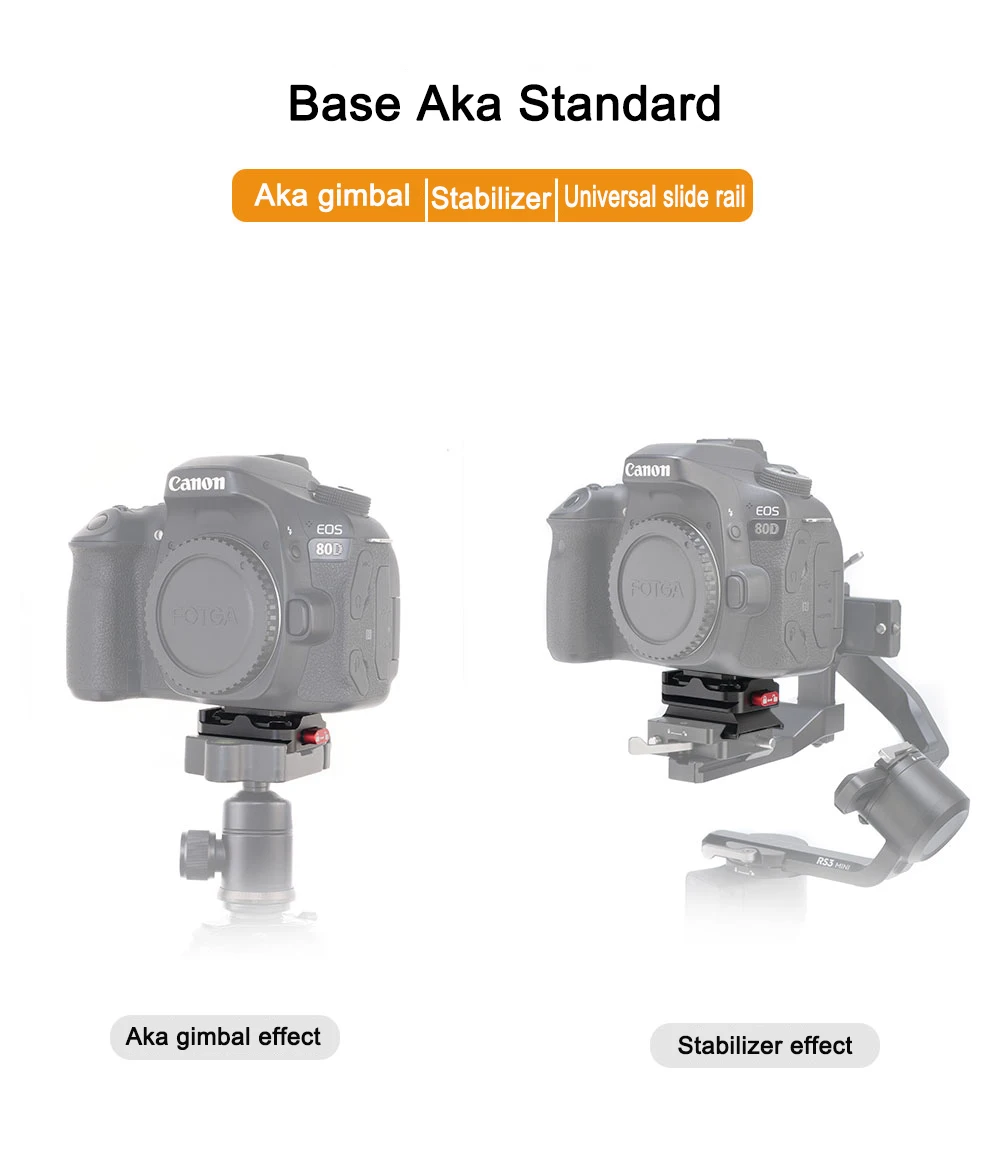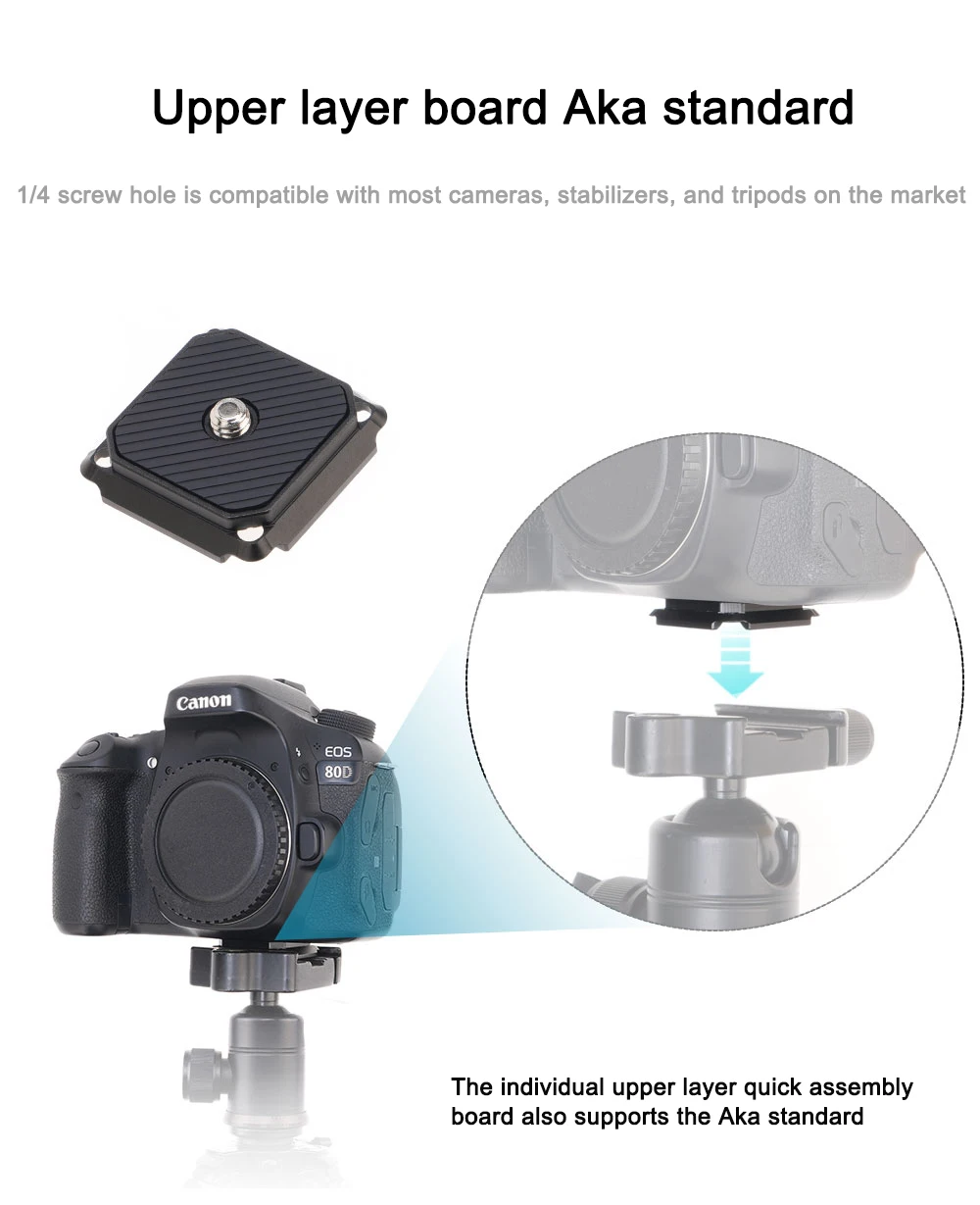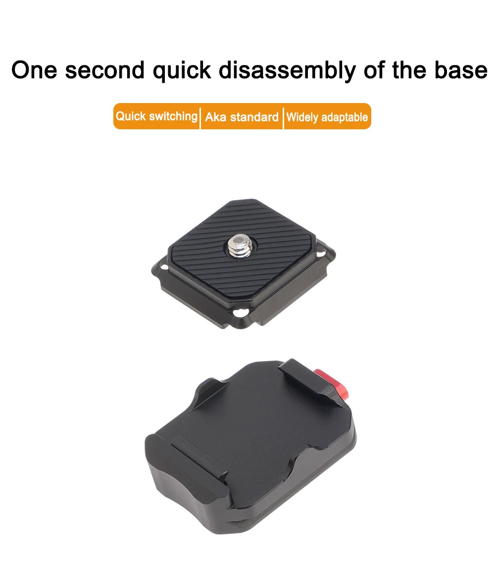 Múltiples interfaces, ampliamente compatibles: el lado de la interfaz Aka de montaje rápido Aka, con un agujero roscado 1/4 reservado y un agujero roscado 3/8 en la parte inferior, es ampliamente compatible con estabilizadores, cardanes ordinarios, trípodes, toboganes y otros equipos.