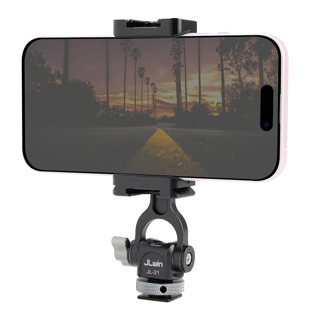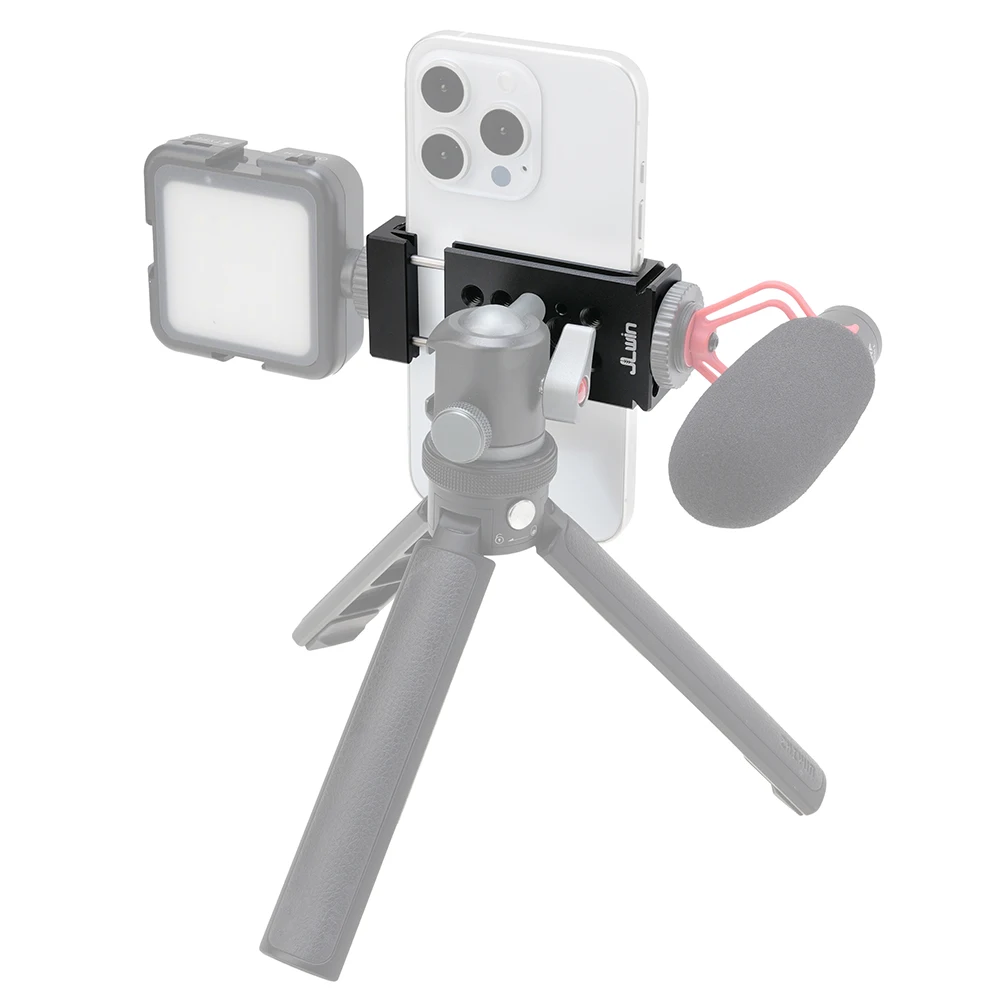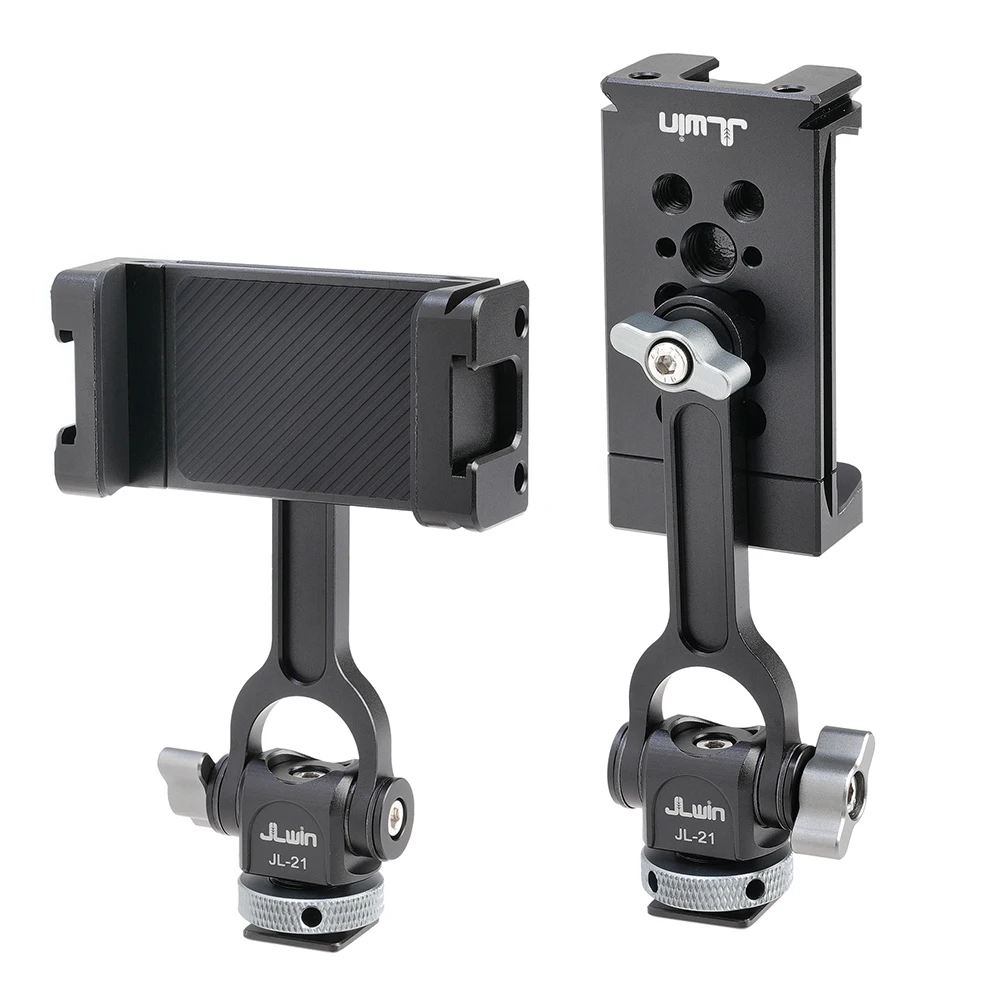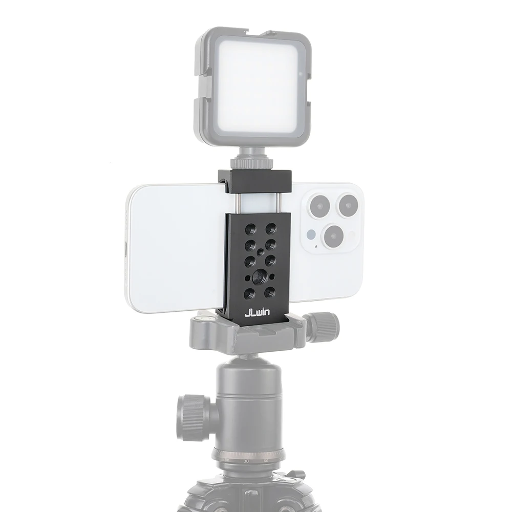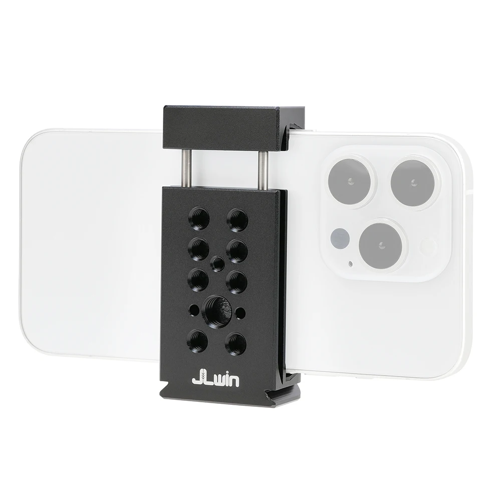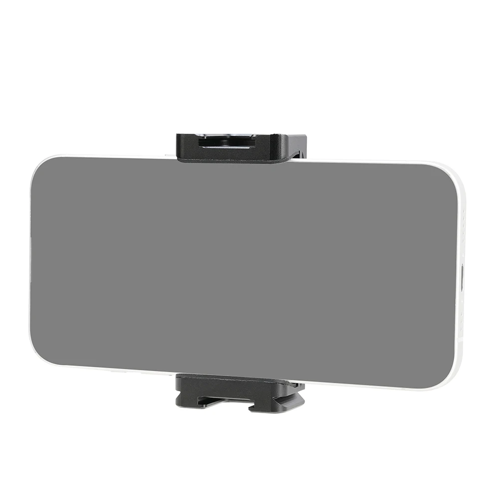 Soportes triples de zapata fría y dos orificios de expansión de 1/4 ": el soporte para teléfono inteligente con 2 zapatas frías laterales y 1 Zapata fría trasera, y 2 orificios de tornillo traseros de 1/4" 3/8 ". Puede conectar luz LED, micrófono u otros dispositivos adicionales. Es una herramienta muy práctica para YouTubers, Vloggers y fotógrafos al aire libre.