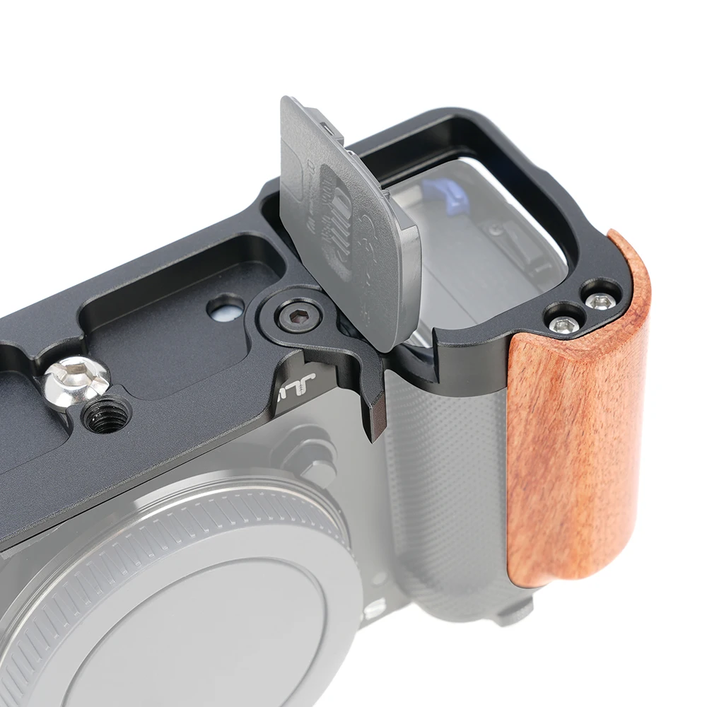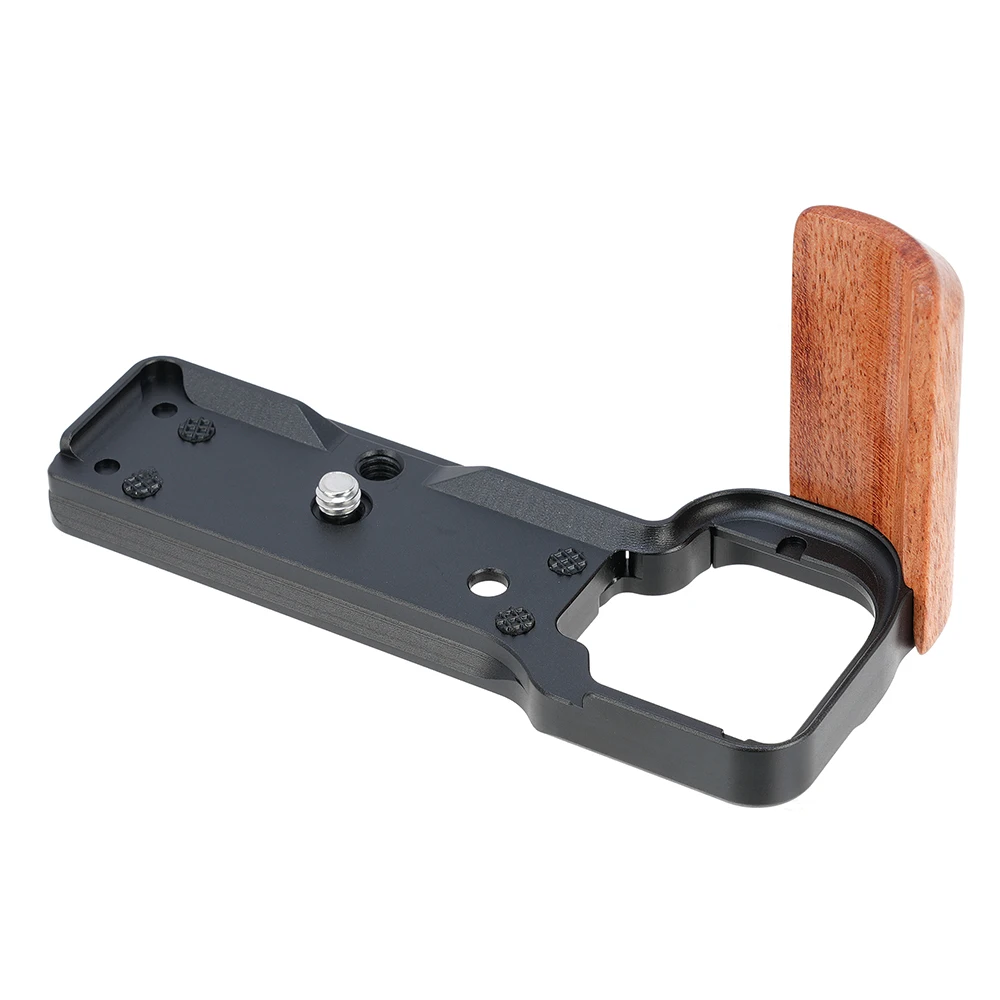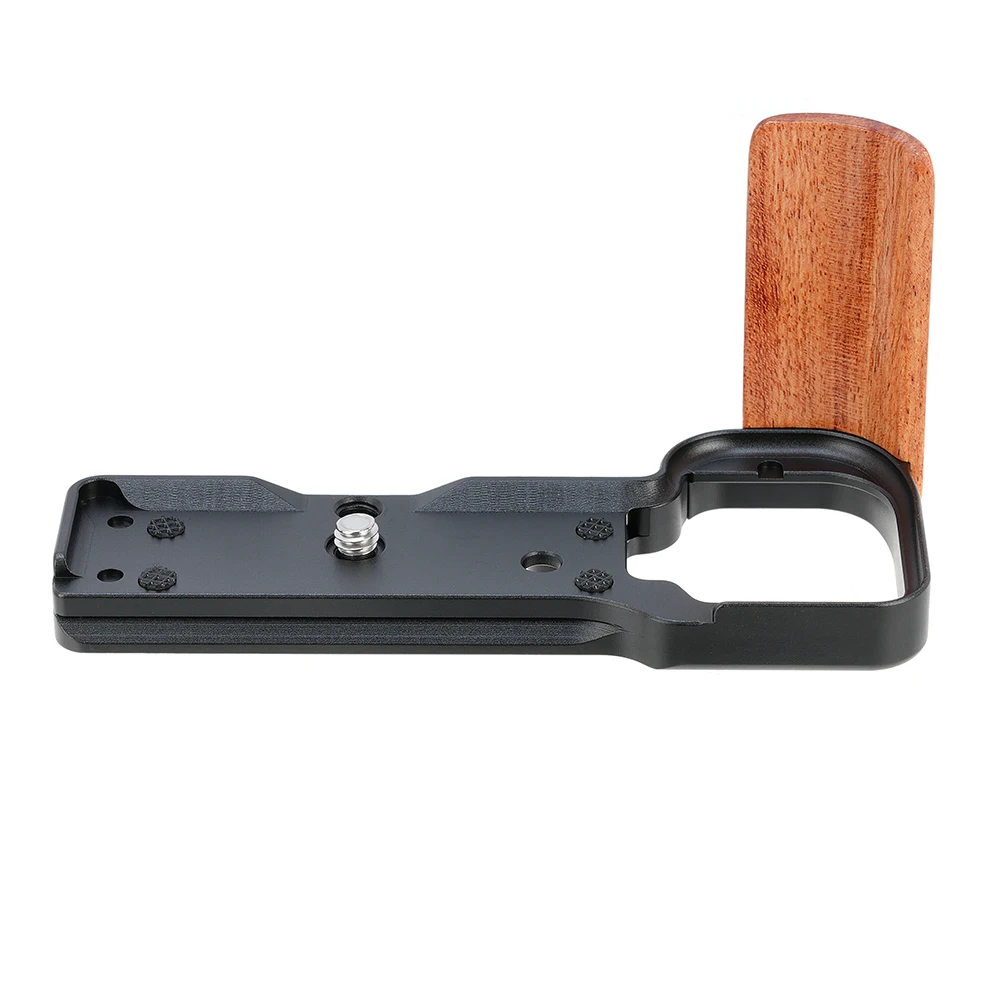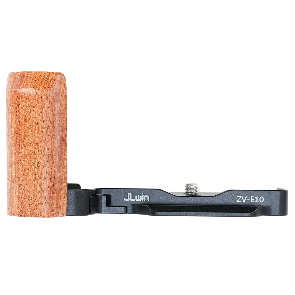1. Expanding Mounting Options: This camera L Plate features multiple 1/4'' screw holes and ARRI 3/8'' screw holes, providing versatile mounting options for other equipment.2. Versatile Connection Ports: The top of the L Plate has a cold shoe base for mounting a microphone or fill light, while the bottom features multiple 1/4'' threaded holes and a 38mm Arca-compatible port for attaching to tripods or other accessories.3. Lightweight and Durable Construction: Constructed from high-quality aluminum alloy material using CNC machining and anodic oxidation treatment, this L Plate features a porous design that maximizes strength while reducing weight.4. User-Friendly Design: The non-slip pad on the bottom of the L Plate prevents scratches and wear, while the ergonomic wooden handle provides a comfortable grip. This L Plate is designed specifically for the Sony ZV-E10 camera.5. Easy Battery Access: The L Plate includes a battery opening at the bottom, providing convenient access for batterySpecification: