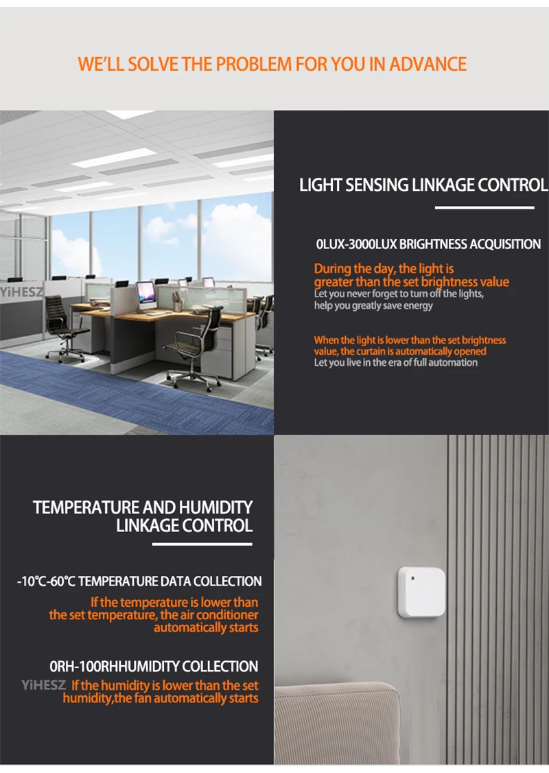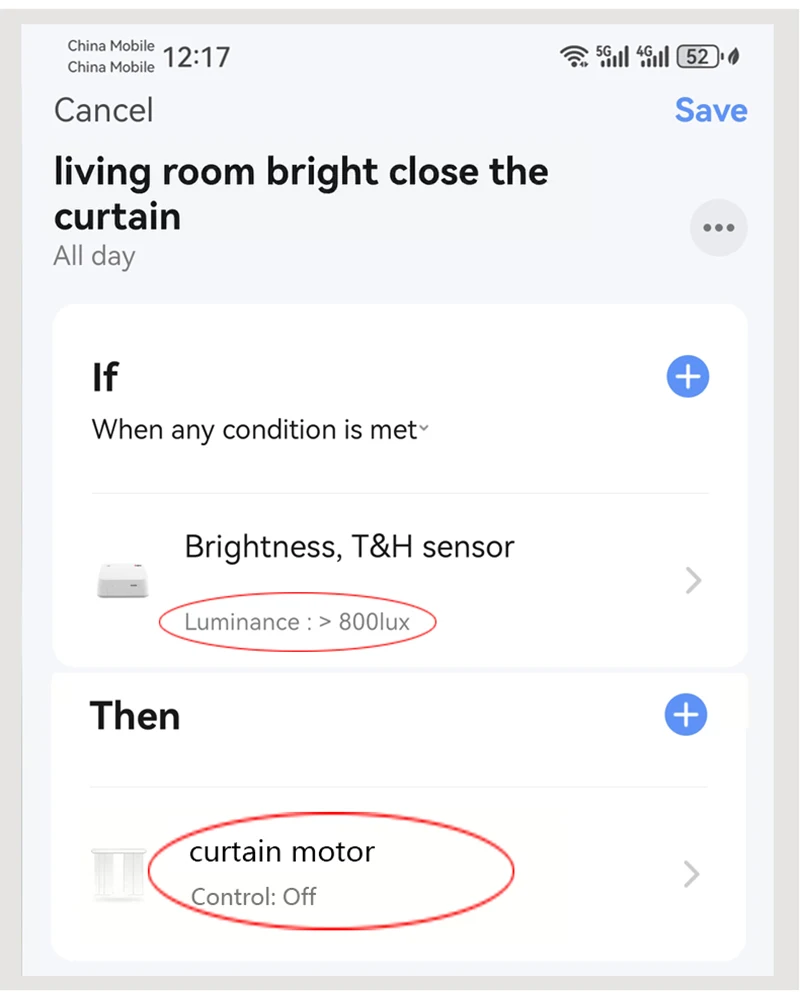 El usuario comprueba el brillo actual de la luz (por ejemplo,500LUX) a través de la APP.El usuario configura la APLICACIÓN para apagar las cortinas inteligentes de la sala cuando el valor de brillo es mayor o igual a 800LUX; El dispositivo sensor de temperatura y humedad de brillo monitorea los cambios en el brillo de la luz en todo momento.Cuando el brillo es mayor o igual a 8000LUX, el sistema apaga automáticamente las cortinas inteligentes y viceversa.