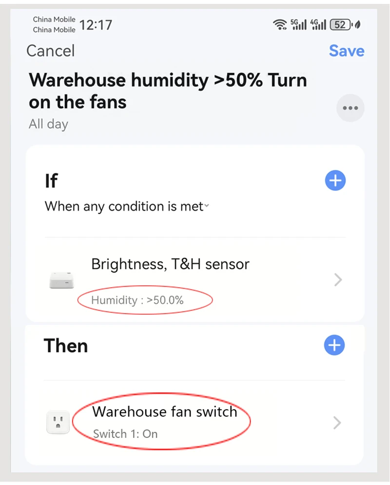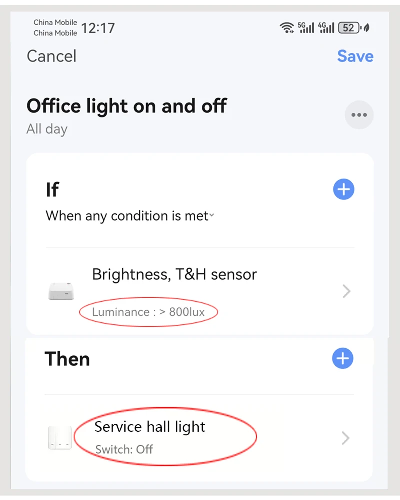 Durante el día, el usuario comprueba el brillo actual de la luz (por ejemplo,500LUX) a través de la APP.El usuario configura la APLICACIÓN para apagar todos los interruptores inteligentes o bombillas inteligentes de la sala de estar cuando el valor de brillo es mayor o igual a 550LUX;El dispositivo sensor de temperatura y humedad de brillo monitorea los cambios en el brillo de la luz en todo momento.Cuando el brillo es mayor o igual a 550LUX, el sistema apaga automáticamente todas las luces de la sala para lograr un ahorro de energía de percepción inteligente y viceversa.
