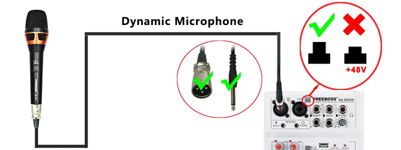 Para el micrófono dinámico, no utilice alimentación Phantom de + 48V.